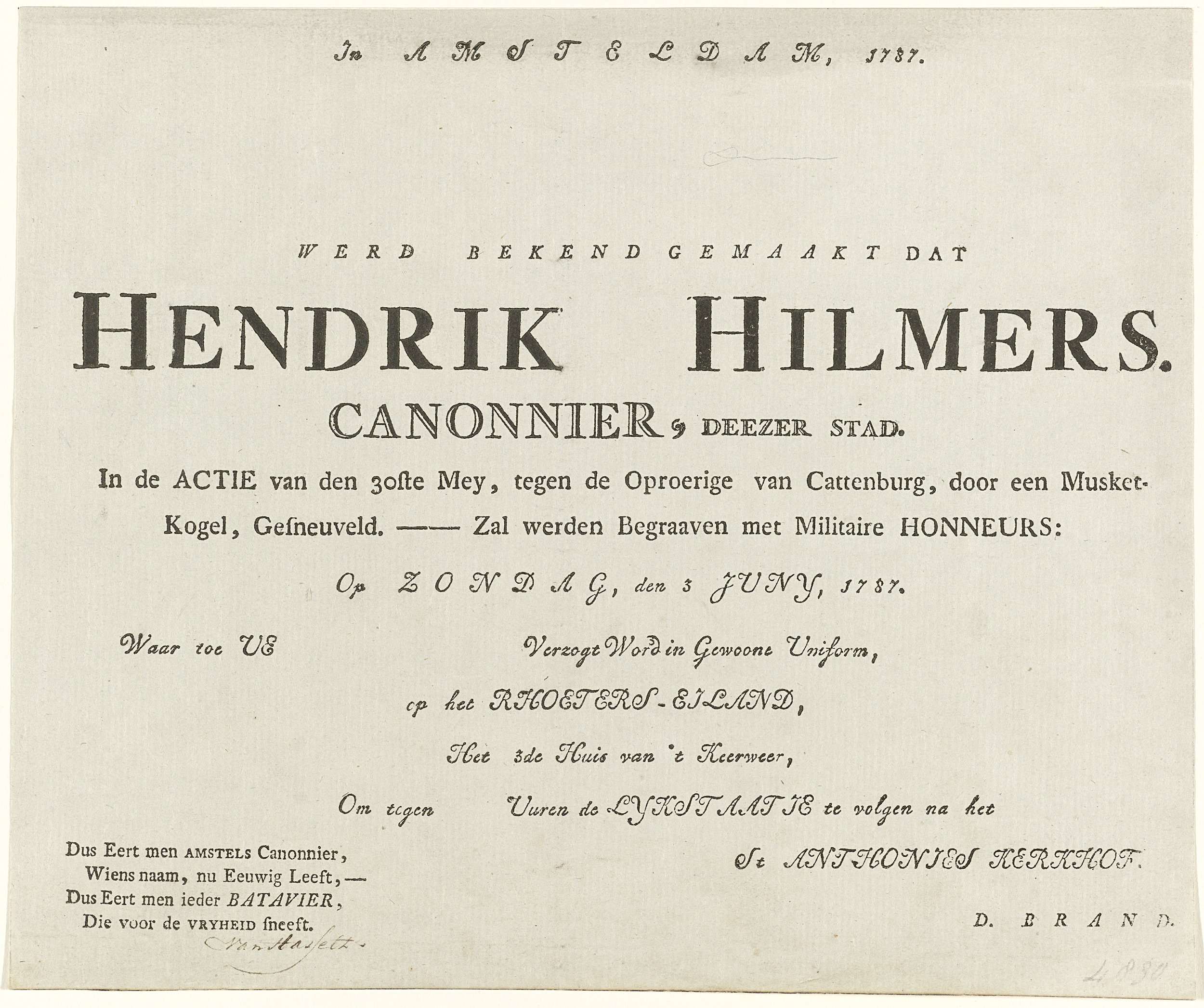 Begrafenisbriefje. Bekendmaking en uitnodiging voor het bijwonen van de begrafenis op 3 juni van Hendrik Hilmers, kanonnier gesneuveld tijdens het oproer op Kattenburg in Amsterdam op 30 mei 1787. Met rechtsonder een vierregelig vers.