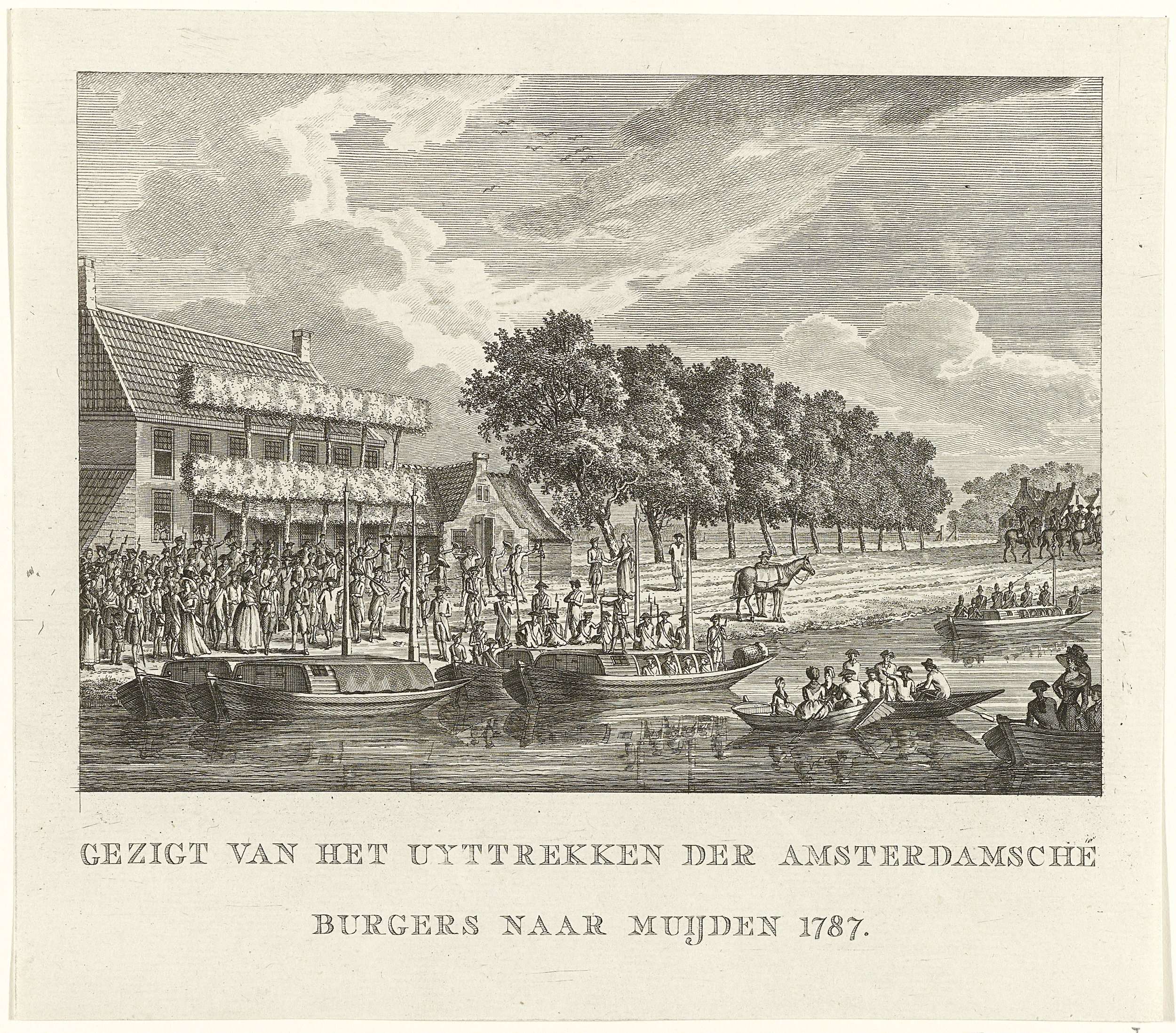 Vertrek van de gewapende Amsterdamse burgers vanuit de uitspanning Lokhorst aan de Weesperzijde in schuiten naar Muiden, 7 juni 1787. De prent heeft een pendant.