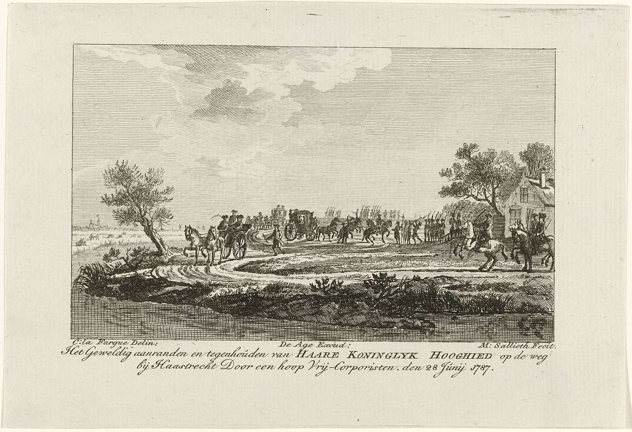 Aanhouding van de stoet van rijtuigen met prinses Wilhelmina van Pruisen door een exercitiegenootschap bij Goejanverwellesluis, 28 juni 1787.