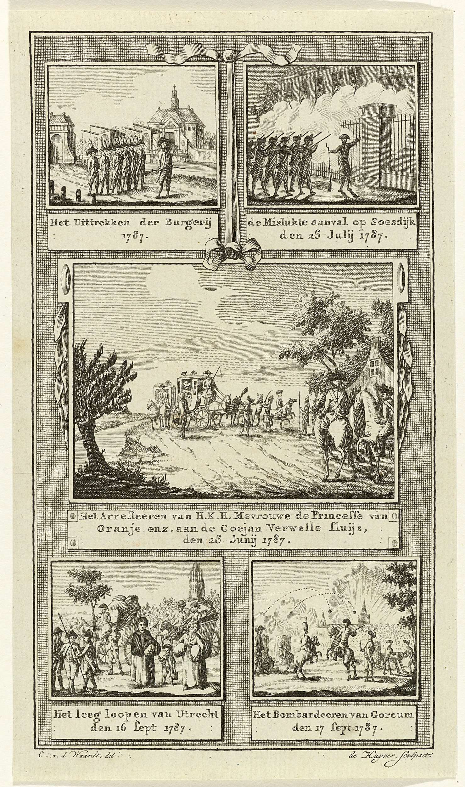 Titelprent met vijf voorstellingen van gebeurtenissen in de zomer van 1787. Centraal de aanhouding van het rijtuig met prinses Wilhelmina van Pruisen bij Goejanverwellesluis, 28 juni 1787. Halftitel voor het tweede deel in een boek over de onlusten te Amsterdam tussen de Patriotten en de Prinsgezinden in 1787.