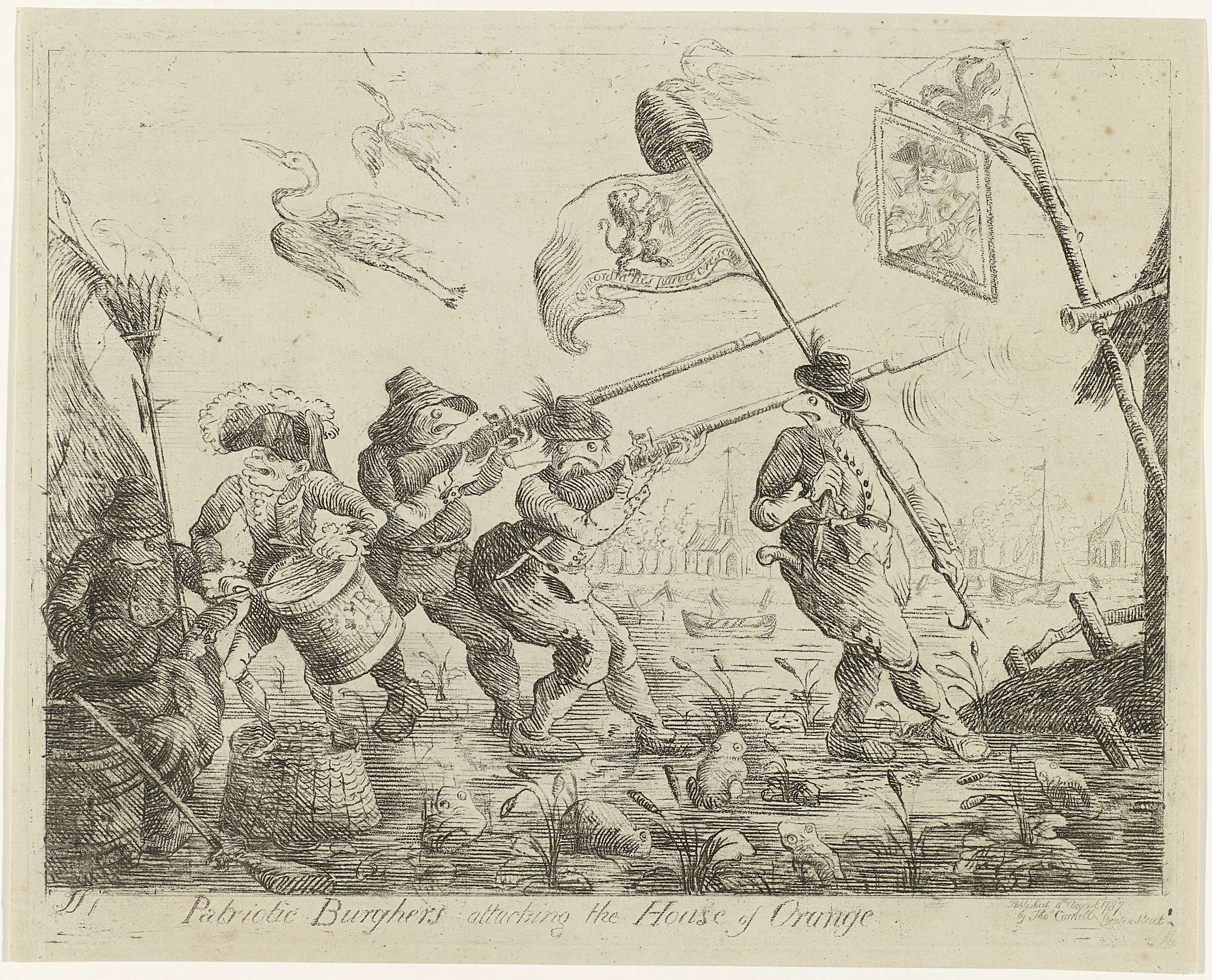 Spotprent op de aanhouding van prinses Wilhelmina van Pruisen te Goejanverwellesluis door patriotten, 28 juni 1787. Een groep van kikkers verkleed als patriotse soldaten voeren, hiertoe aangespoord door een Franse trommelaar, een aanval uit op een hut met een aanhangbord met de Prins van Oranje en een vaandel met de dubbele adelaar van Pruisen.