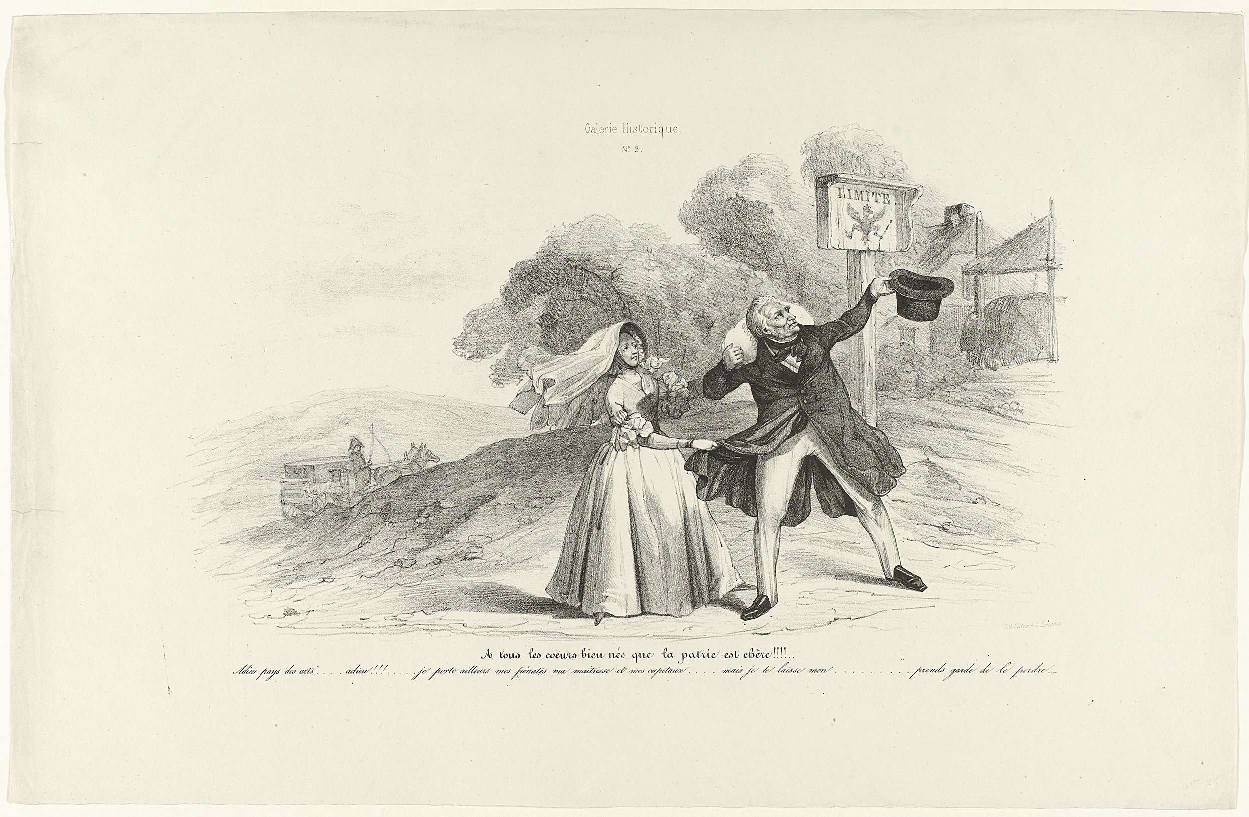Spotprent op het vertrek van de voormalige koning Willem I naar Pruisen na zijn troonsafstand op 7 oktober 1840. Bij de grens zegt Willem zijn vaderland vaarwel terwijl rijksgravin Henriëtte d'Oultremont de Wégimont hem over de grens naar Pruisen trekt. Op de achtergrond wacht de koets. Met tweeregelig onderschrift in het Frans.