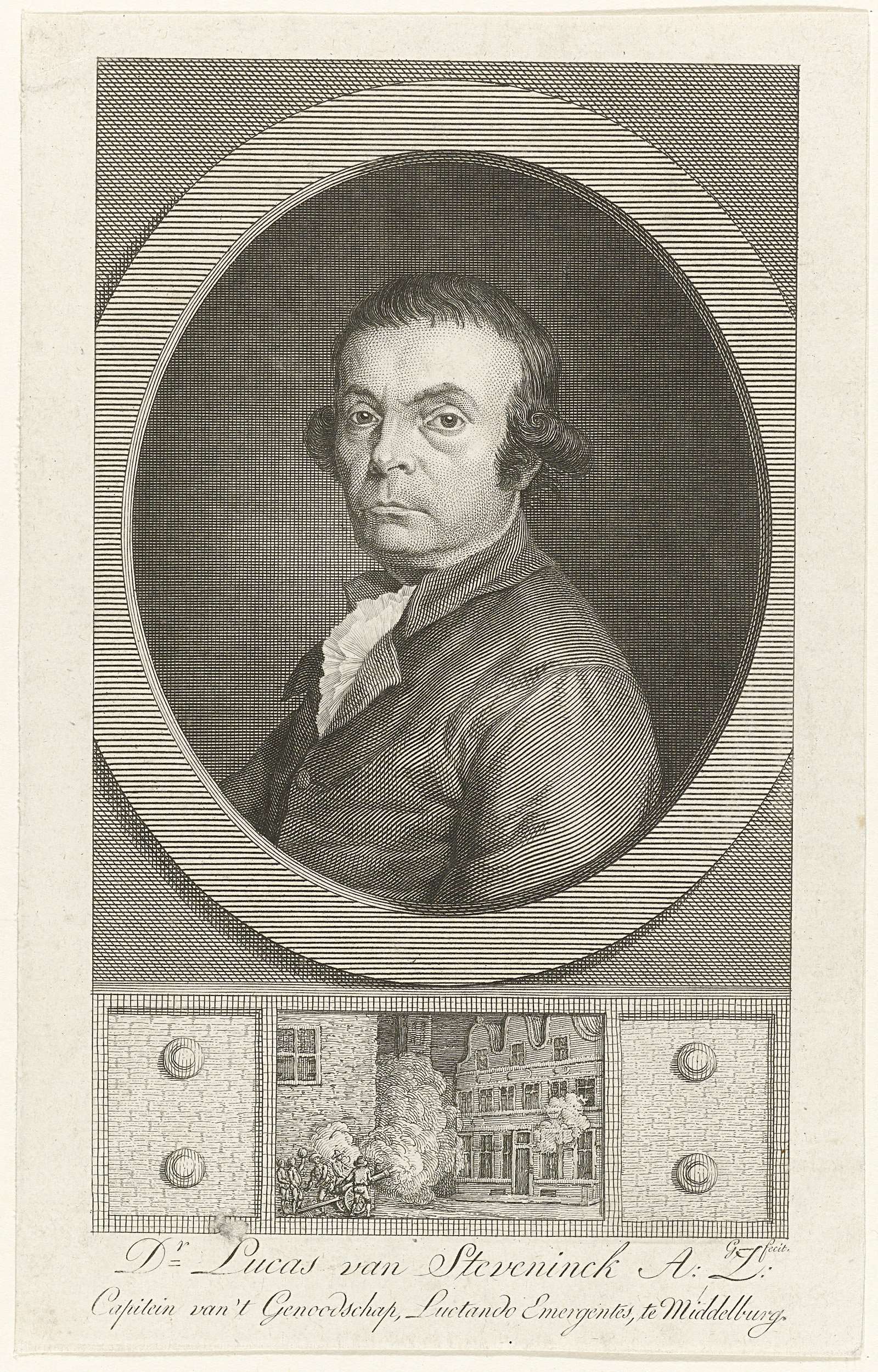 Portret van de patriotse arts Lucas van Steveninck, onderaan een kleine voorstelling van de beschieting van zijn huis te Middelburg door Oranjegezinden in de nacht van 30 juni op 1 juli 1787.