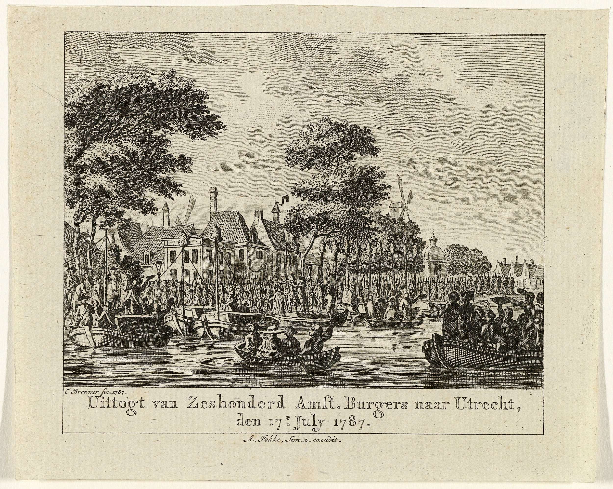 Gezicht op de herberg Berebijt aan de Amstel van waar schuiten met de 600 gewapende Amsterdamse burgers inschepen en vertrekken naar Utrecht, 17 juli 1787.