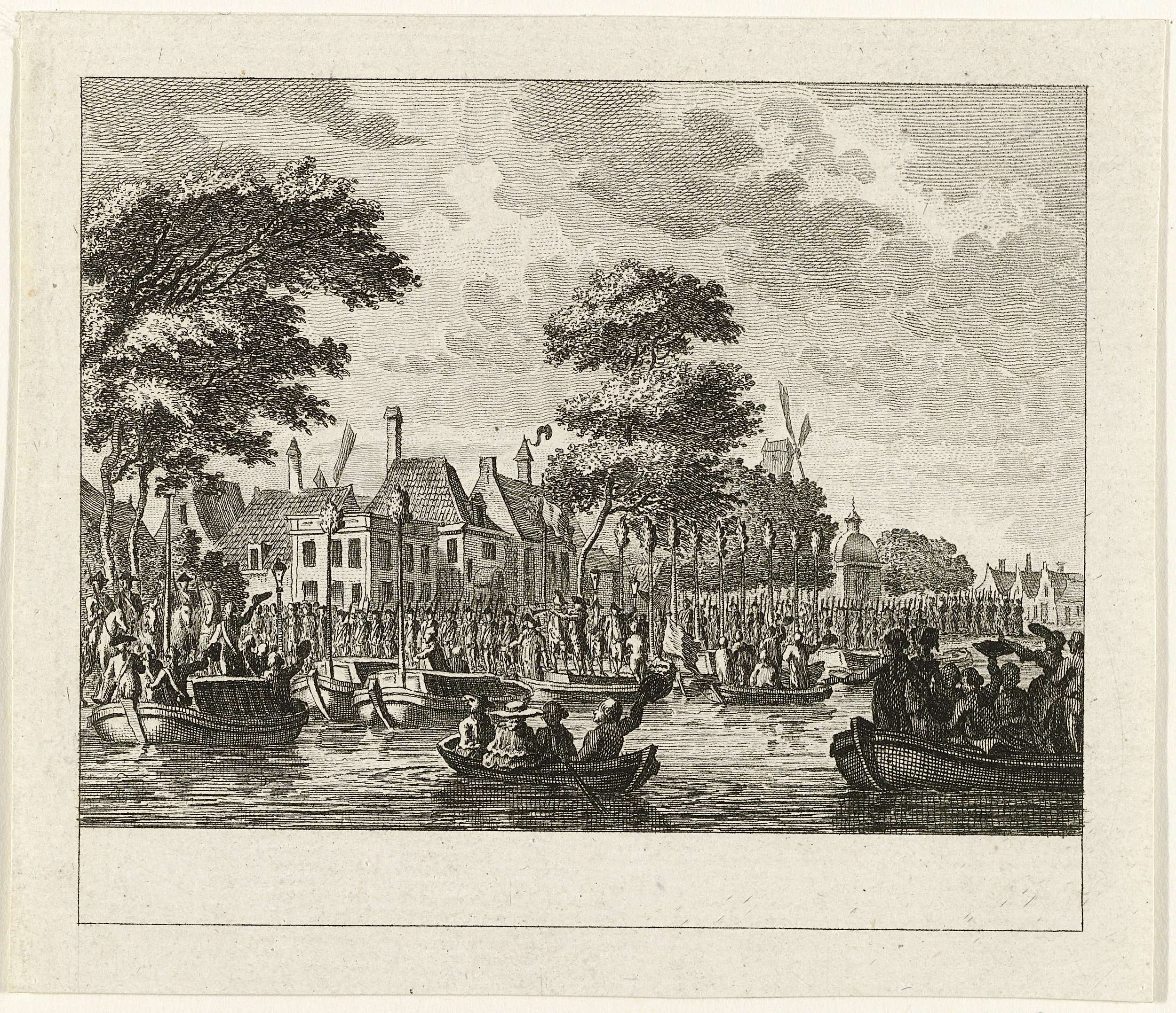 Gezicht op de herberg Berebijt aan de Amstel van waar schuiten met de 600 gewapende Amsterdamse burgers inschepen en vertrekken naar Utrecht, 17 juli 1787.