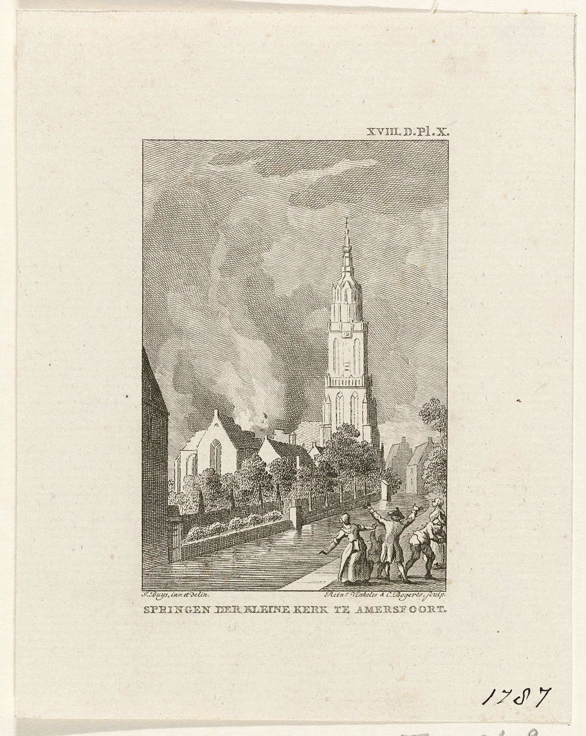 Buskruitontploffing en brand in de Lieve-Vrouwekapel te Amersfoort, 2 augustus 1787. De kerk wordt verwoest, alleen de toren, de Onze-Lieve-Vrouwetoren of Lange Jan, blijft overeind. Gemerkt bovenaan: XVIII.D.Pl.X.