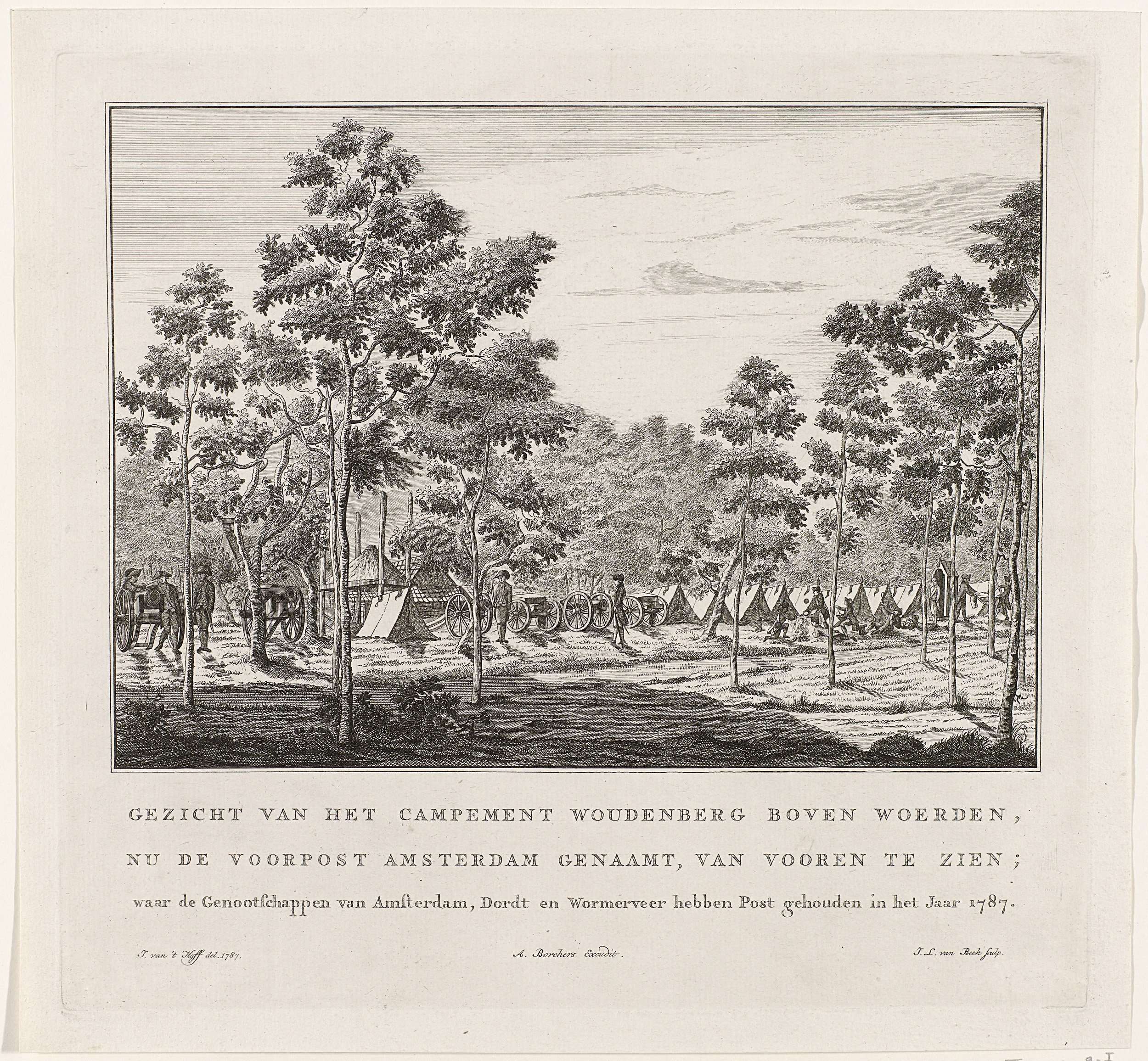 Kampement Woudenberg of Voorpost Amsterdam, bij Woerden, waar de burgerkorpsen van Amsterdam, Dordrecht en Wormerveer hun tenten opgeslagen en kanonnen opgesteld hebben, 3-4 augustus 1787. Gezicht op het kampement van voren. Bij de prent hoort een pendant.