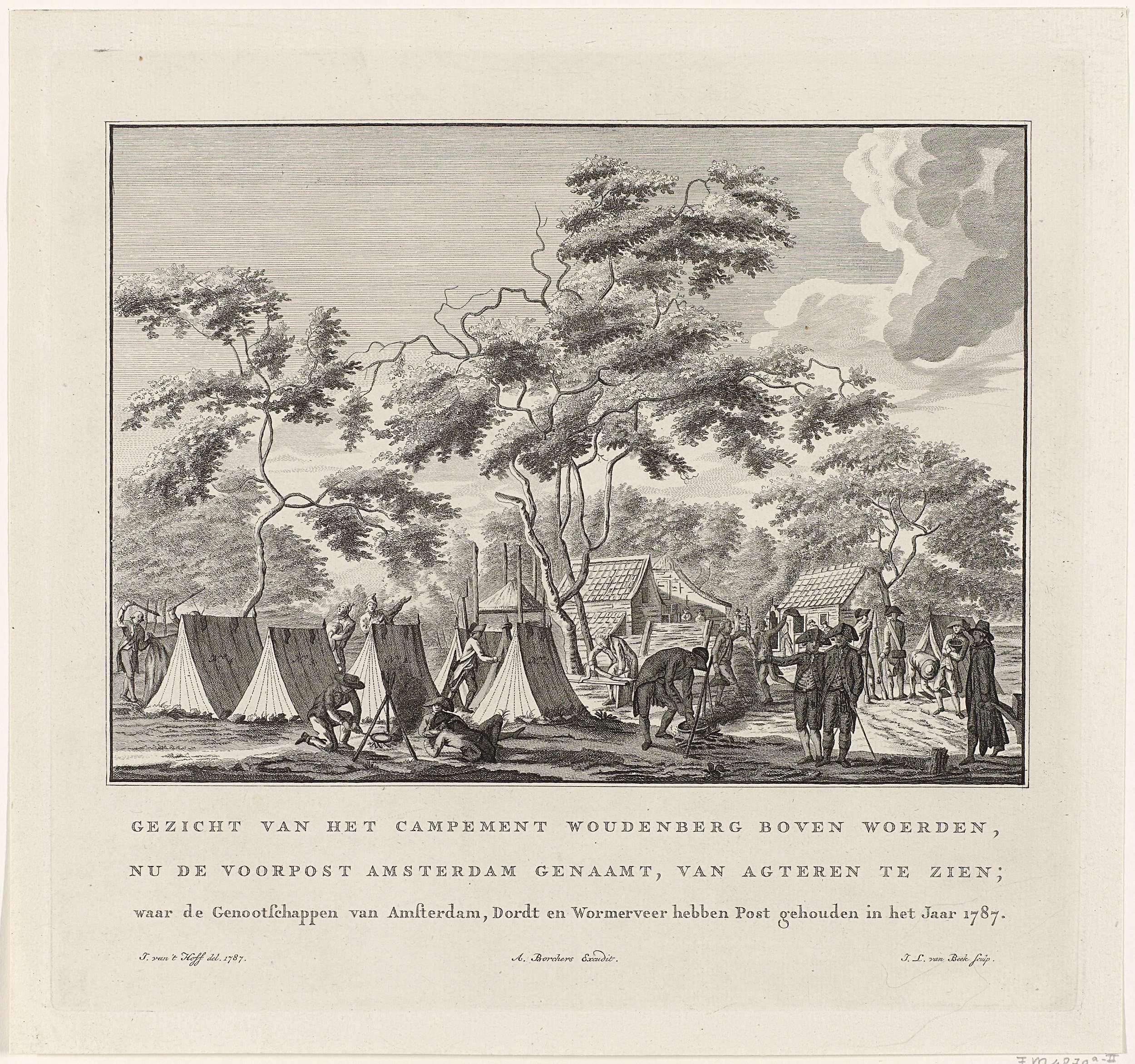 Kampement Woudenberg of Voorpost Amsterdam, bij Woerden, waar de burgerkorpsen van Amsterdam, Dordrecht en Wormerveer hun tenten opgeslagen en kanonnen opgesteld hebben, 3-4 augustus 1787. Gezicht op het kampement van achteren. Bij de prent behoort een pendant.
