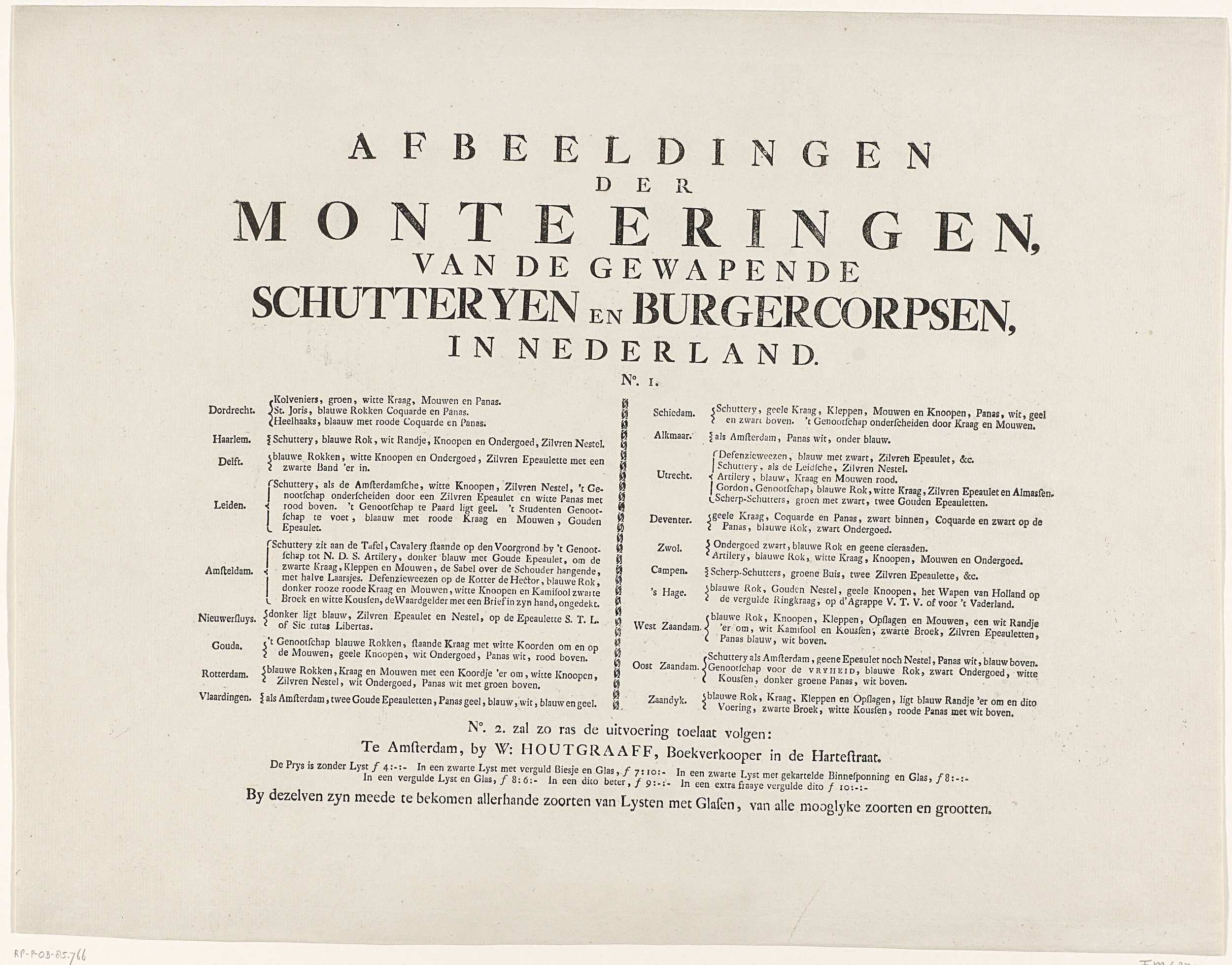 Tekstblad met een lijst van de verschillende monteringen van schutterijen en burgerkorpsen in Nederland in 1787. Behorend bij de eerste prent met de zaal met de schutters in uniform. Onderaan de aankondiging door de uitgever van de uitgave van de tweede plaat (die nooit is verschenen) en een prijslijst.