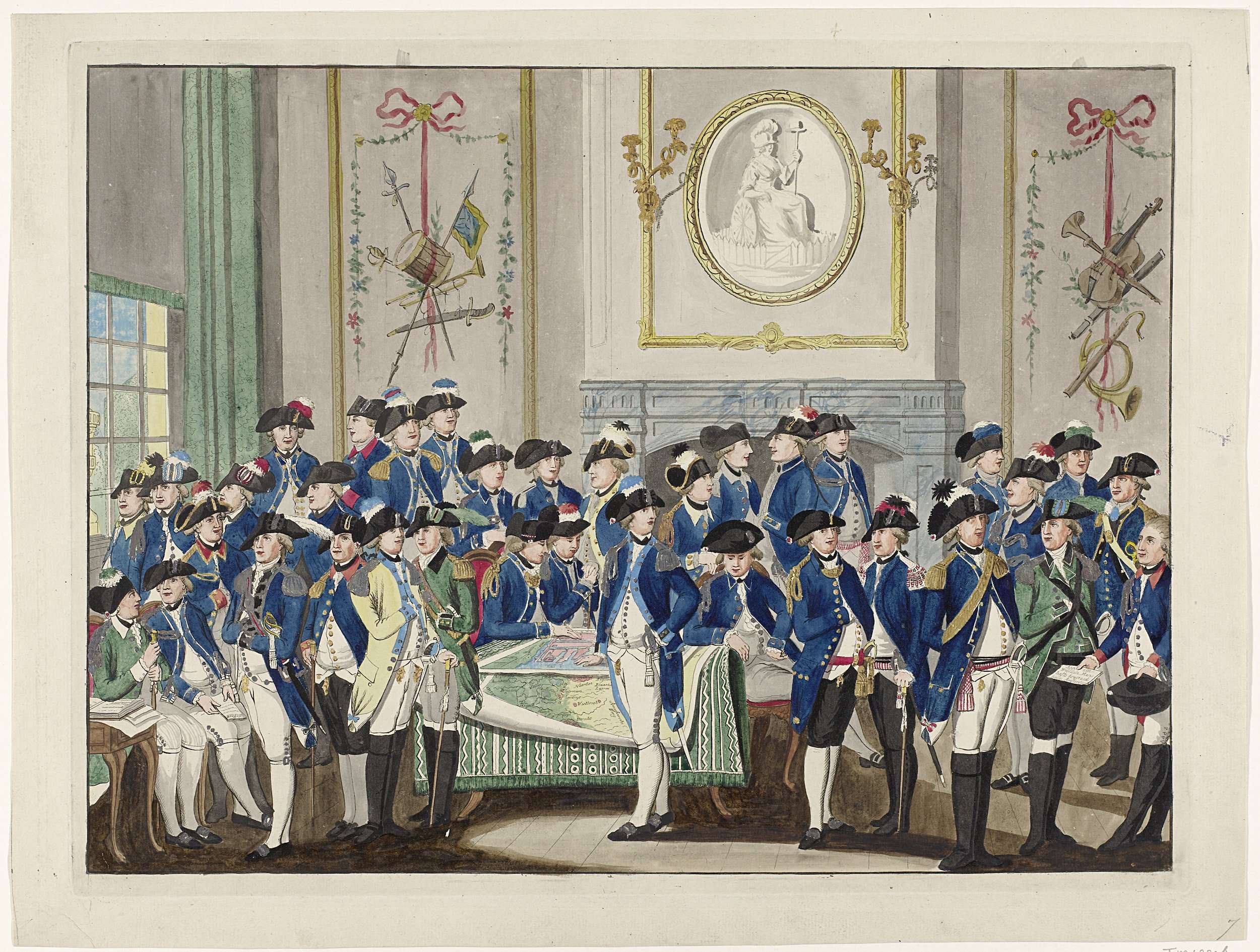 Zaal met 35 schutters in de verschillende monteringen (uniformen) van schutterijen en burgerkorpsen in Nederland in 1787. Op een tafel liggen kaarten die worden bestudeerd. Tegen de achterwand schilderingen van zittende Vrijheid in Hollandse Tuin, links een trofee van wapens, rechts een trofee van muziekinstrumenten.