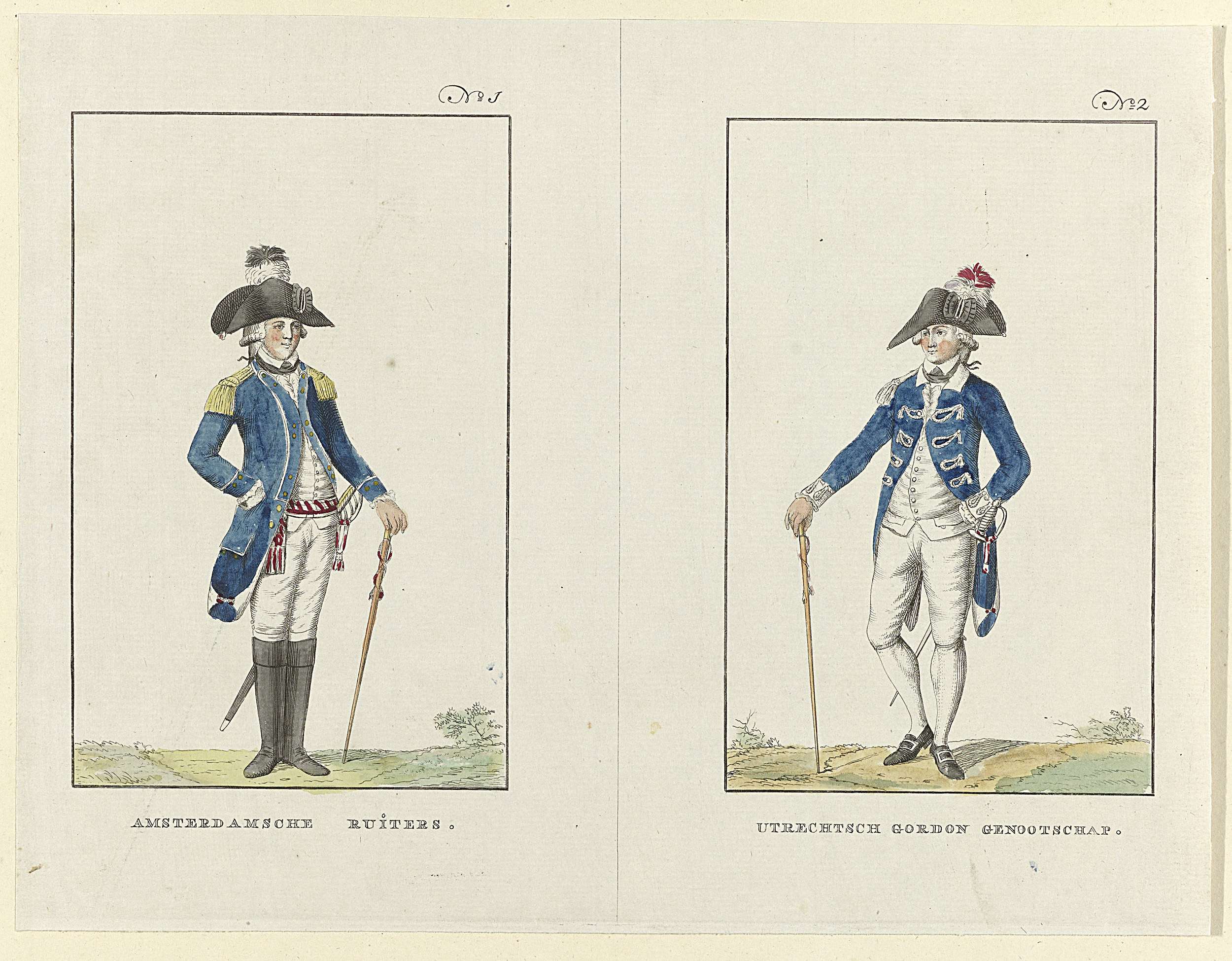 Blad met twee uniformvoorstellingen genummerd No. 1 en 2. Links het uniform van de cavalerie van Amsterdam, rechts het uniform van het Gordon Genootschap te Utrecht. Pendant van het blad met de nrs. 3 en 4 van de verschillende monteringen (uniformen) van patriotse schutterijen en burgerkorpsen in Nederland in 1784.