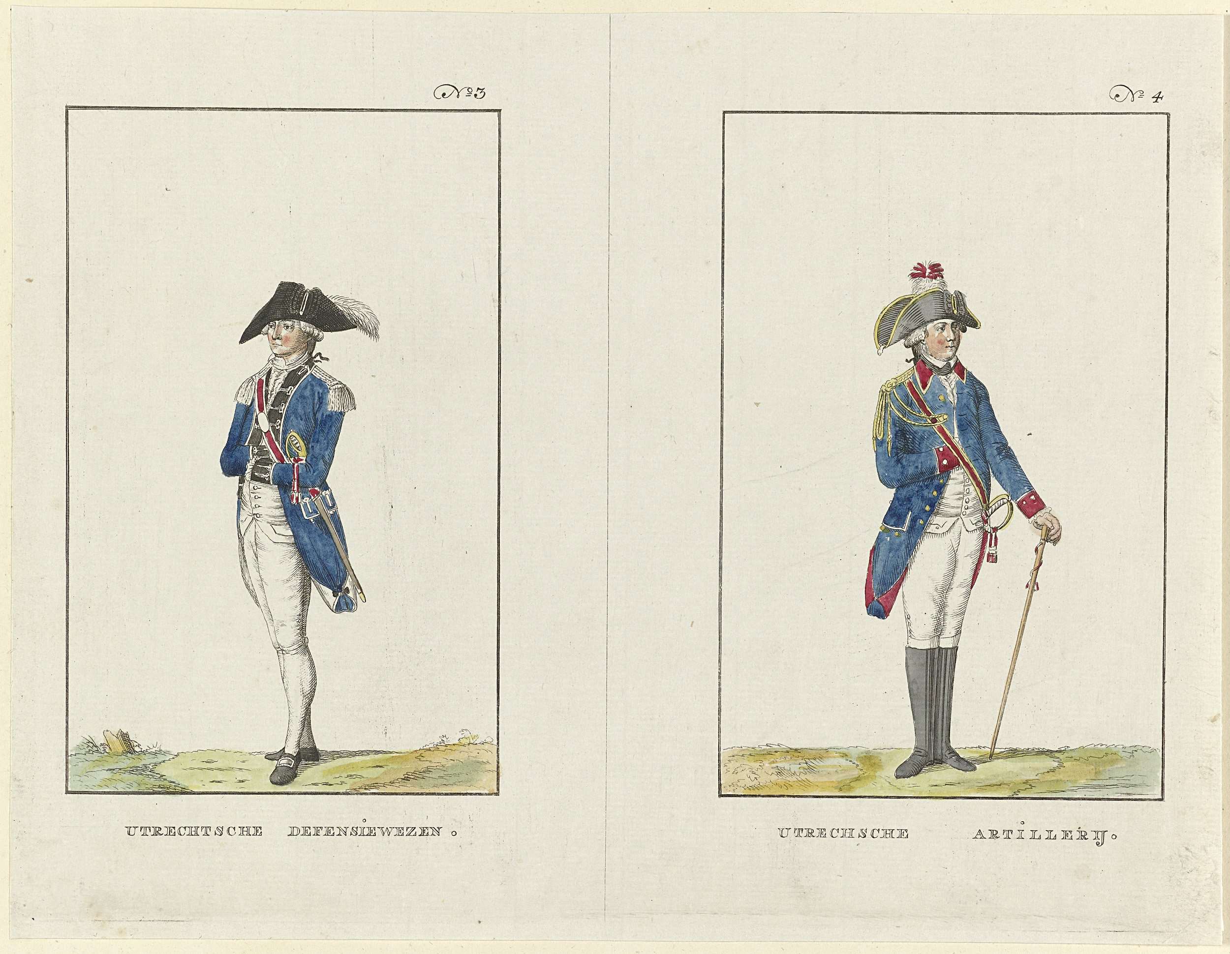 Blad met twee uniformvoorstellingen genummerd No. 3 en 4. Links het uniform van het Utrechtse Defensiewezen, rechts het uniform van de artillerie te Utrecht. Pendant van het blad met de nrs. 1 en 2 van de verschillende monteringen (uniformen) van patriotse schutterijen en burgerkorpsen in Nederland in 1784.