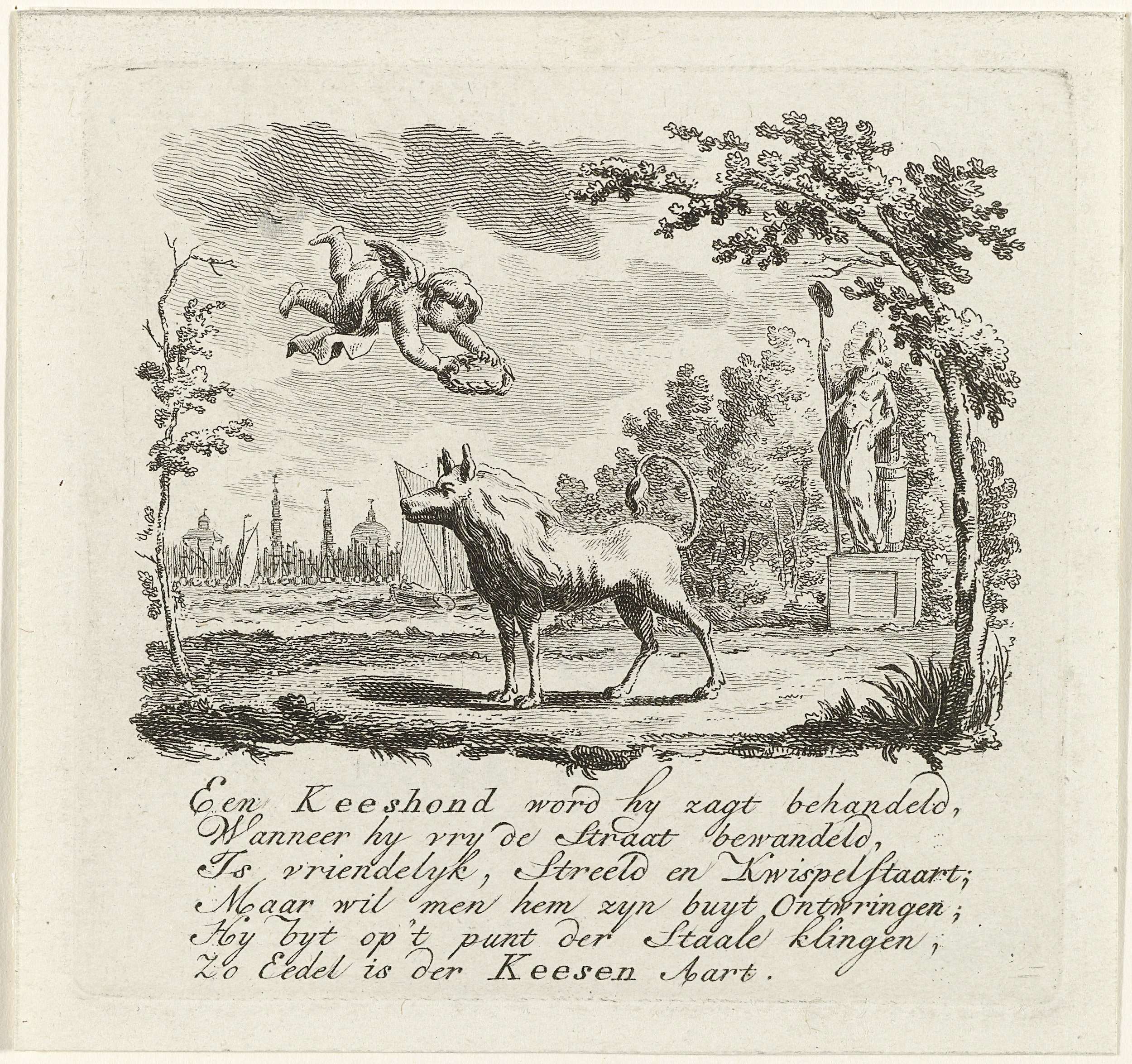 Allegorische voorstelling waarin een keeshond (patriot) door een engel met een lauwerkrans wordt gekroond, ca. 1787. Op de achtergrond een standbeeld van de Vrijheid en het profiel van een stad. In het onderschrift een zesregelig vers.