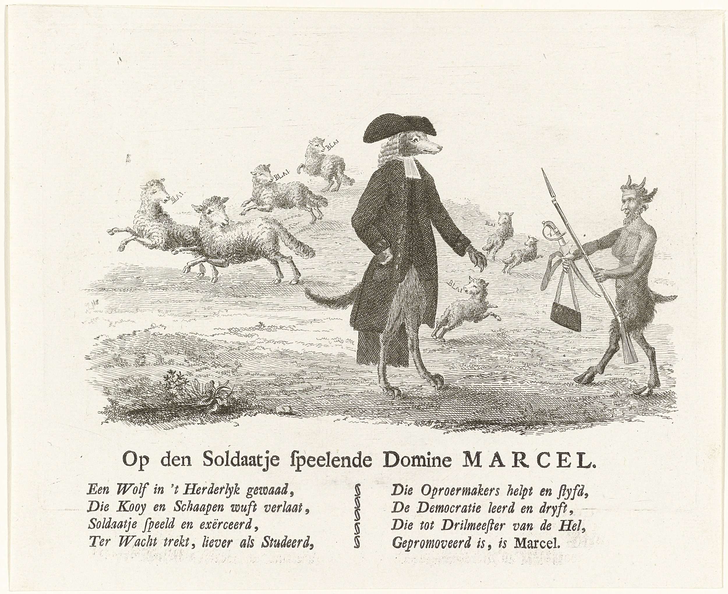 Spotprent op patriotse predikant A. Marcel te Rijswijk (bij Waalwijk), in 1787 gebannen. De dominee als keeshond in predikantenkleding krijgt van de duivel een geweer, sabel en patroontas aangereikt. Op de achtergrond vluchten de schapen van zijn gemeente. Op het blad onder de plaat een achtregelig vers.