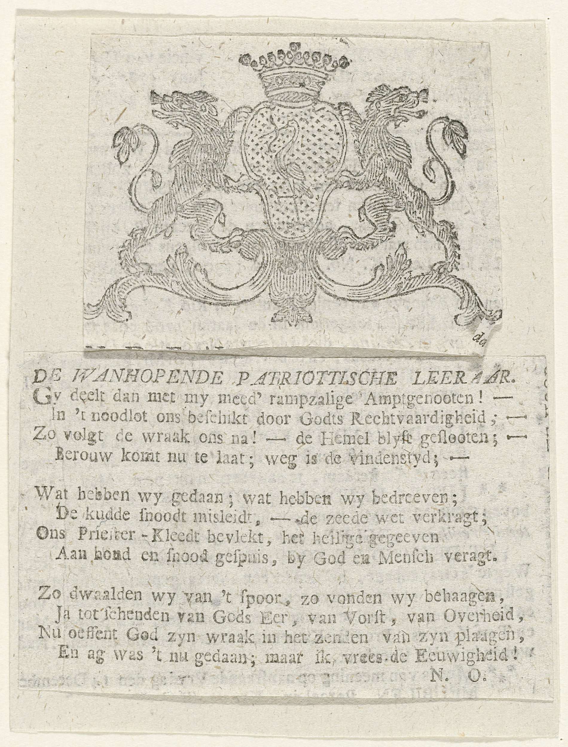 Spotvers op de patriotse predikant A. Marcel te Rijswijk (bij Waalwijk), in 1787 gebannen. Vers in drie coupletten, uit een (Haagse) courant. Op het blad bij het vers een vignet met het wapen van Den Haag.