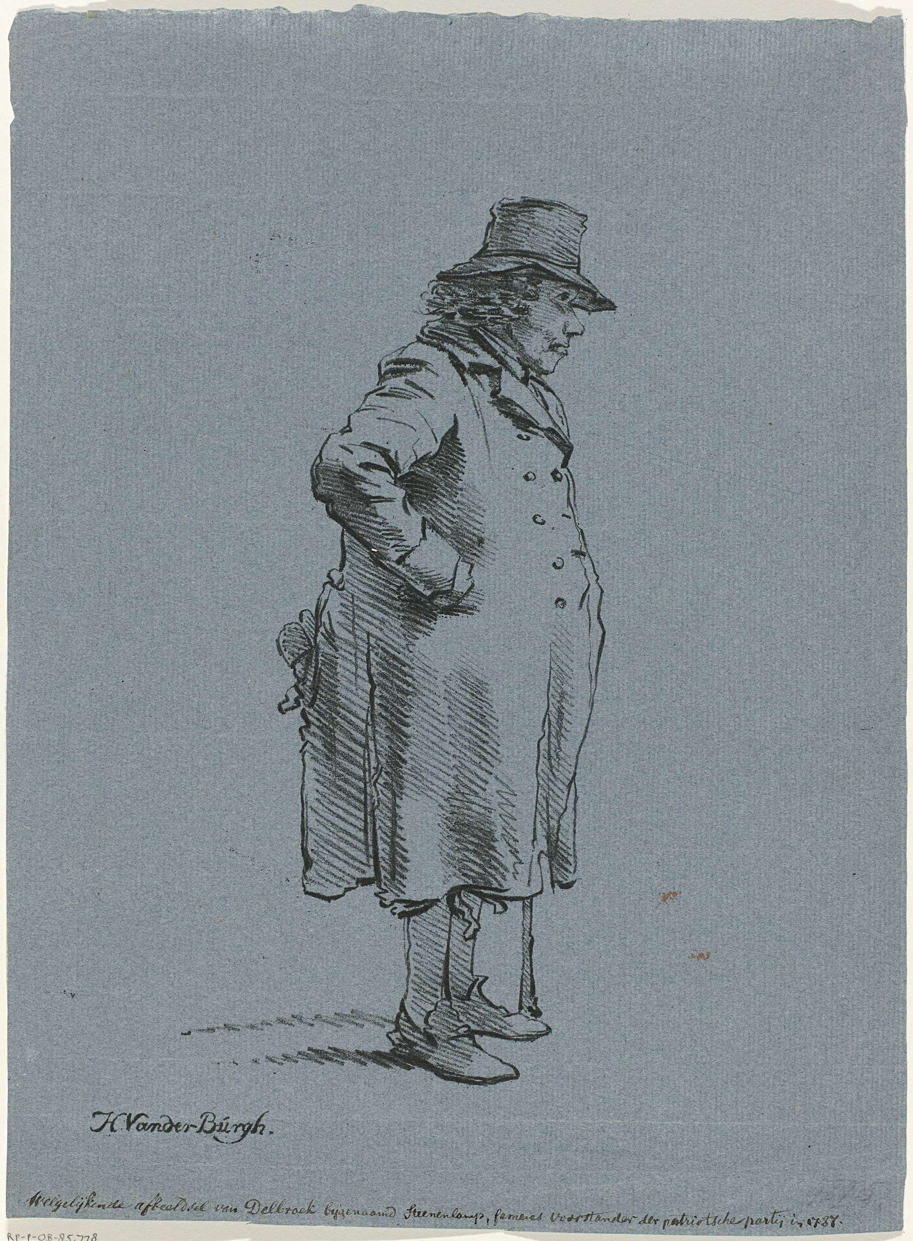Portret van de patriot Hendrik Delbroek, bijgenaamd Steenen Lamp, een Haags straattype, 1787. Staande ten voeten uit naar rechts.