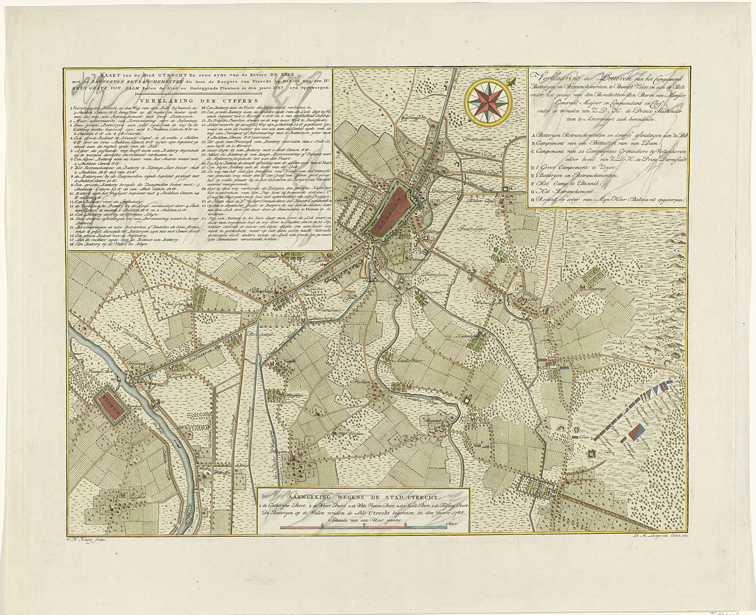 Kaart van de stad Utrecht en omgeving, tot aan Vianen, met de batterijen en retranchementen opgericht onder leiding van de Rijngraaf van Salm ter verdediging van de stad tegen het Staatse leger van de stadhouder gelegen bij Amersfoort, september 1787. Met drie cartouches met legenda's. In de onderste cartouche een schaalstok: Schaale van een uur ...