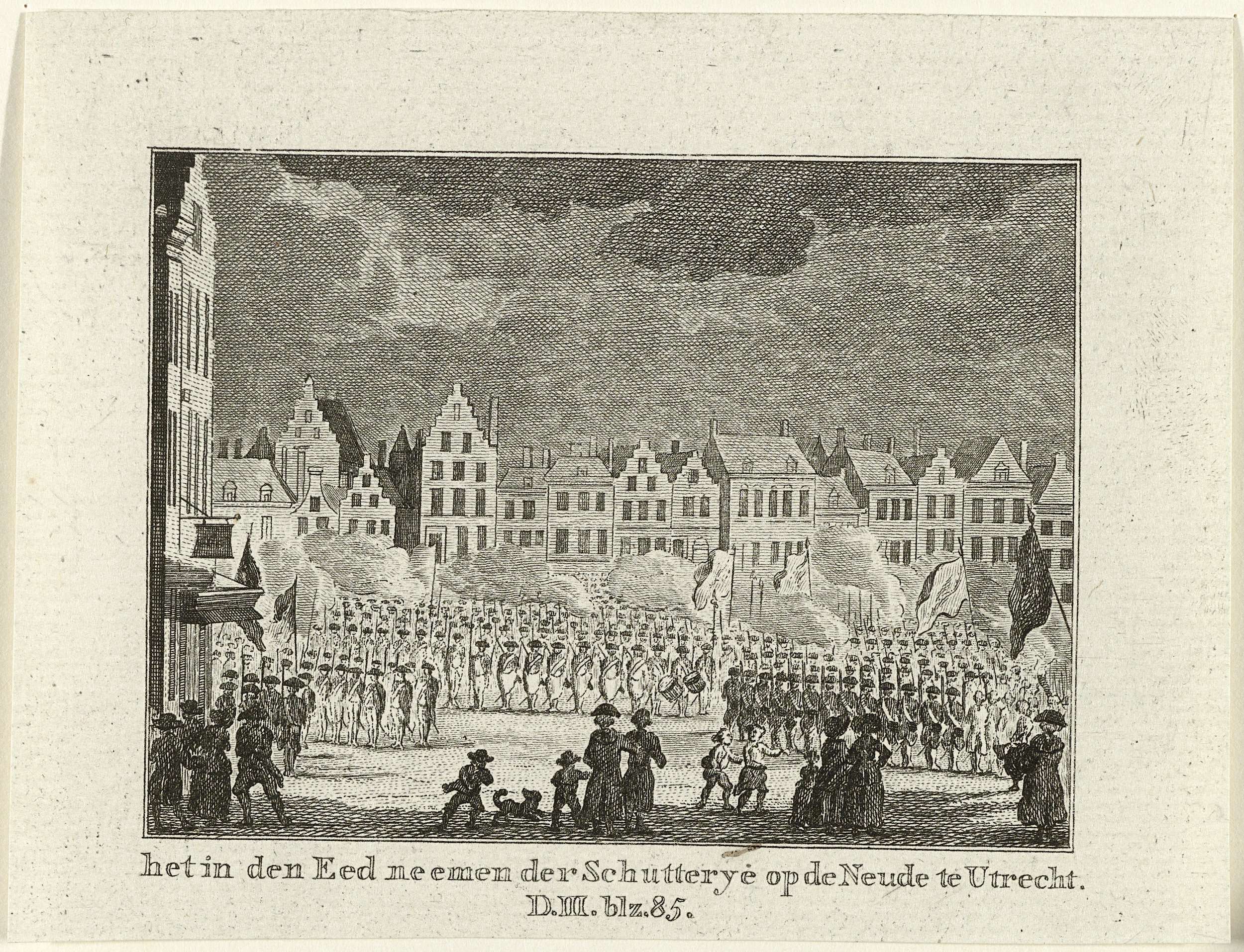 Plechtige inzwering van de schutterij op de Neude te Utrecht, 2 september 1787. Onderaan gemerkt: D.III.blz.85.