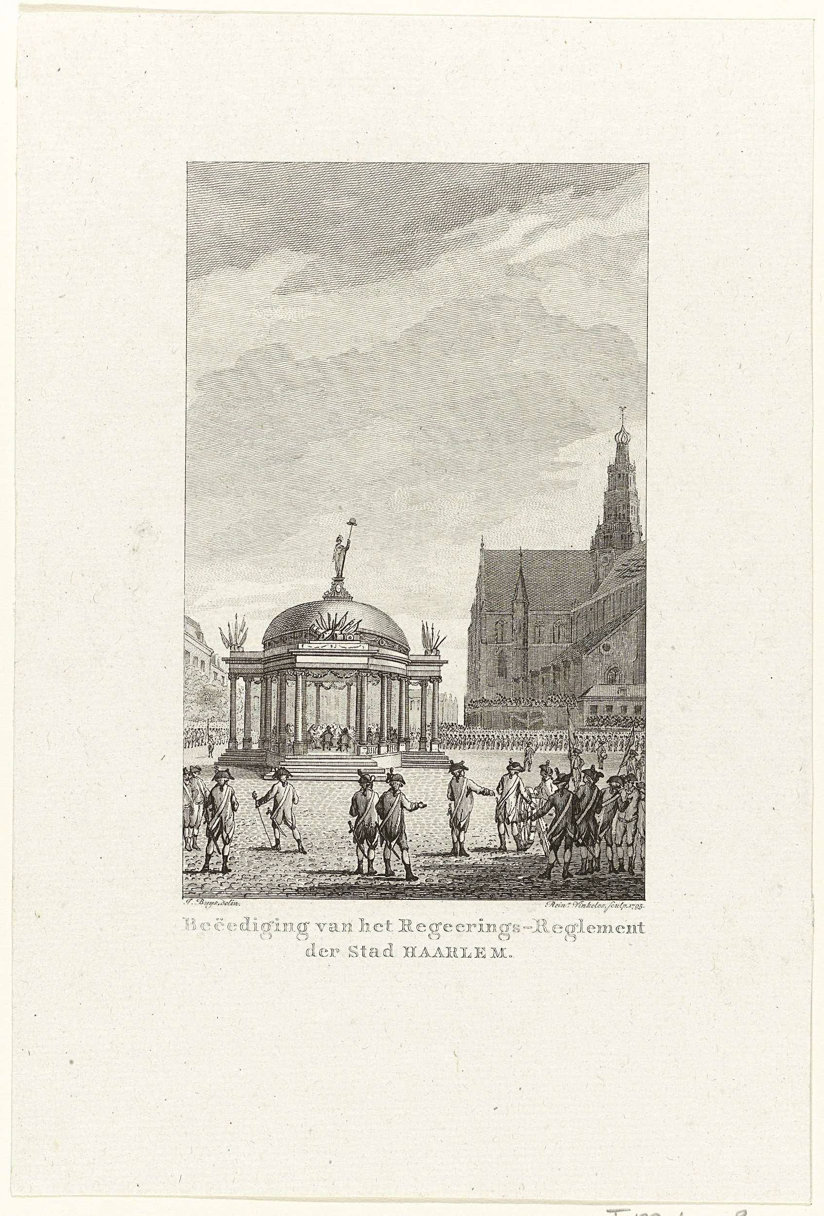 Plechtige ceremonie met de beëdiging van het nieuwe regeringsreglement in een tempel opgericht op de Grote Markt te Haarlem, 5 september 1787. Om het plein staan schutterijen opgesteld.