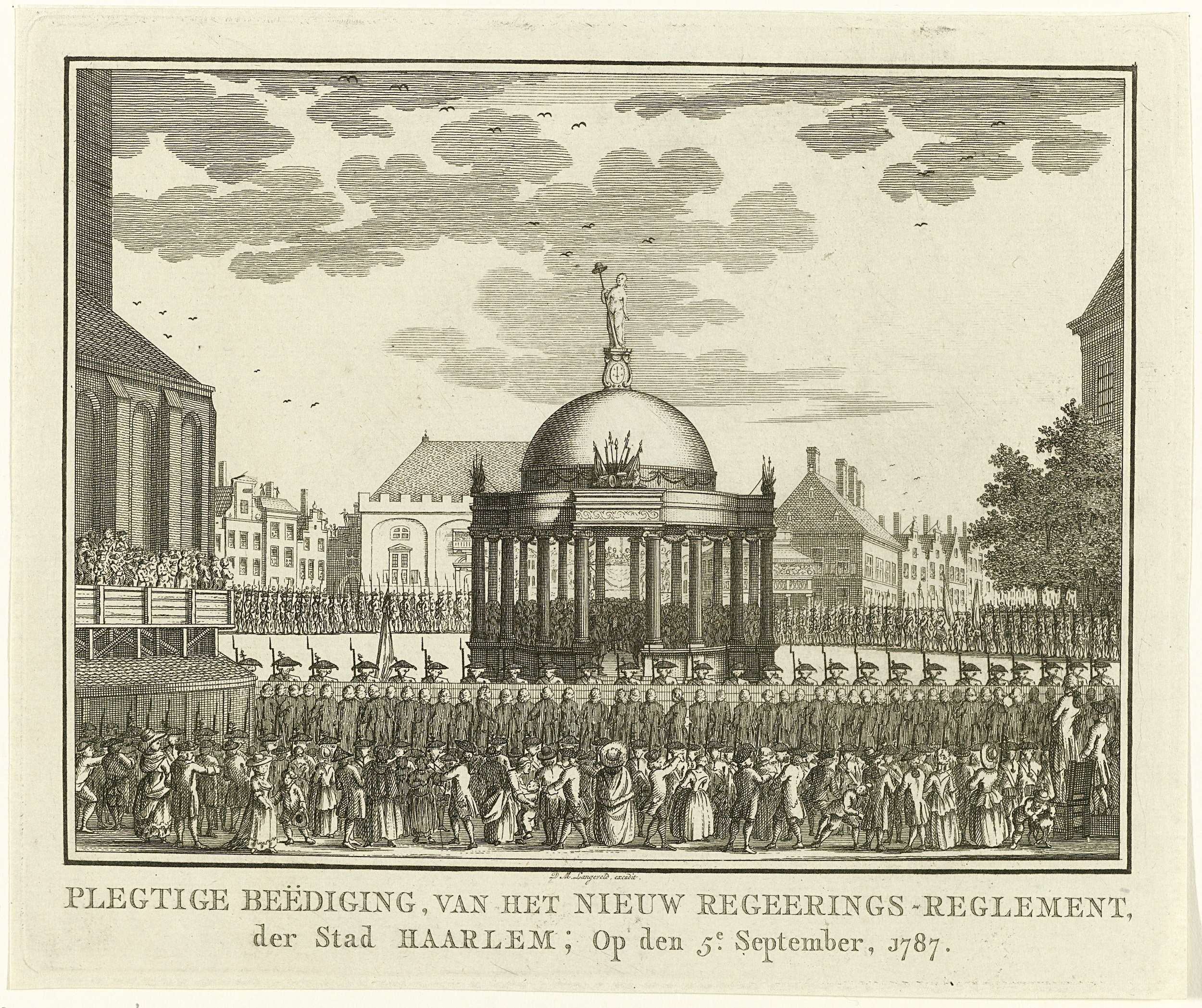 Plechtige ceremonie met de beëdiging van het nieuwe regeringsreglement in een tempel opgericht op de Grote Markt te Haarlem, 5 september 1787. Om het plein staan schutterijen opgesteld. Gezicht naar het stadhuis toe.