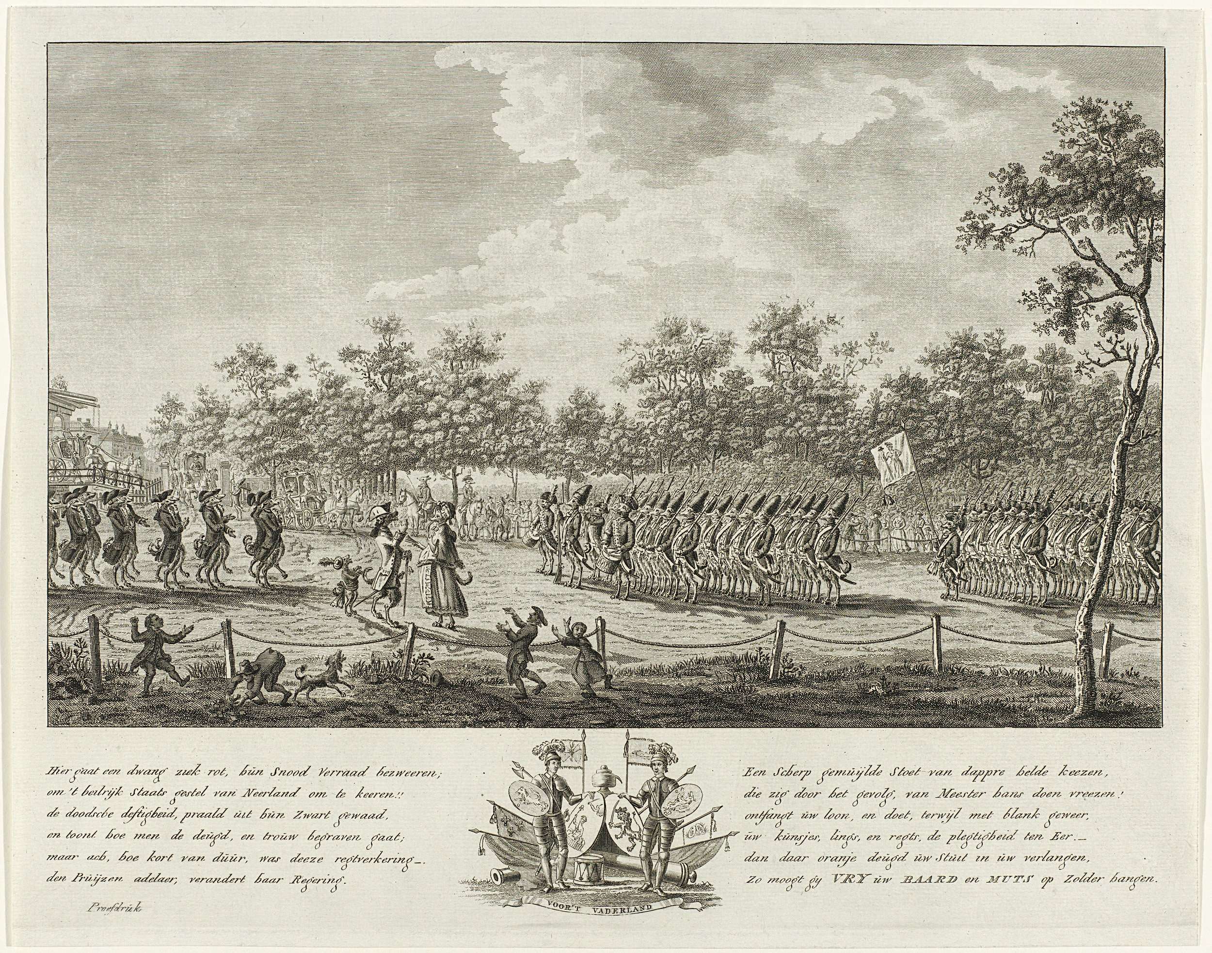 Spotprent op de eedsaflegging van de leden van het patriotse Genootschap van Wapenhandel in Den Haag, in de Koekamp op 7 september 1787. De leden van het vrijkorps voorgesteld als keeshonden die exerceren. Links spreekt een officier met een donatrice. De schutters worden bespot door kinderen op de voorgrond. In de marge een twaalfregelig vers ...
