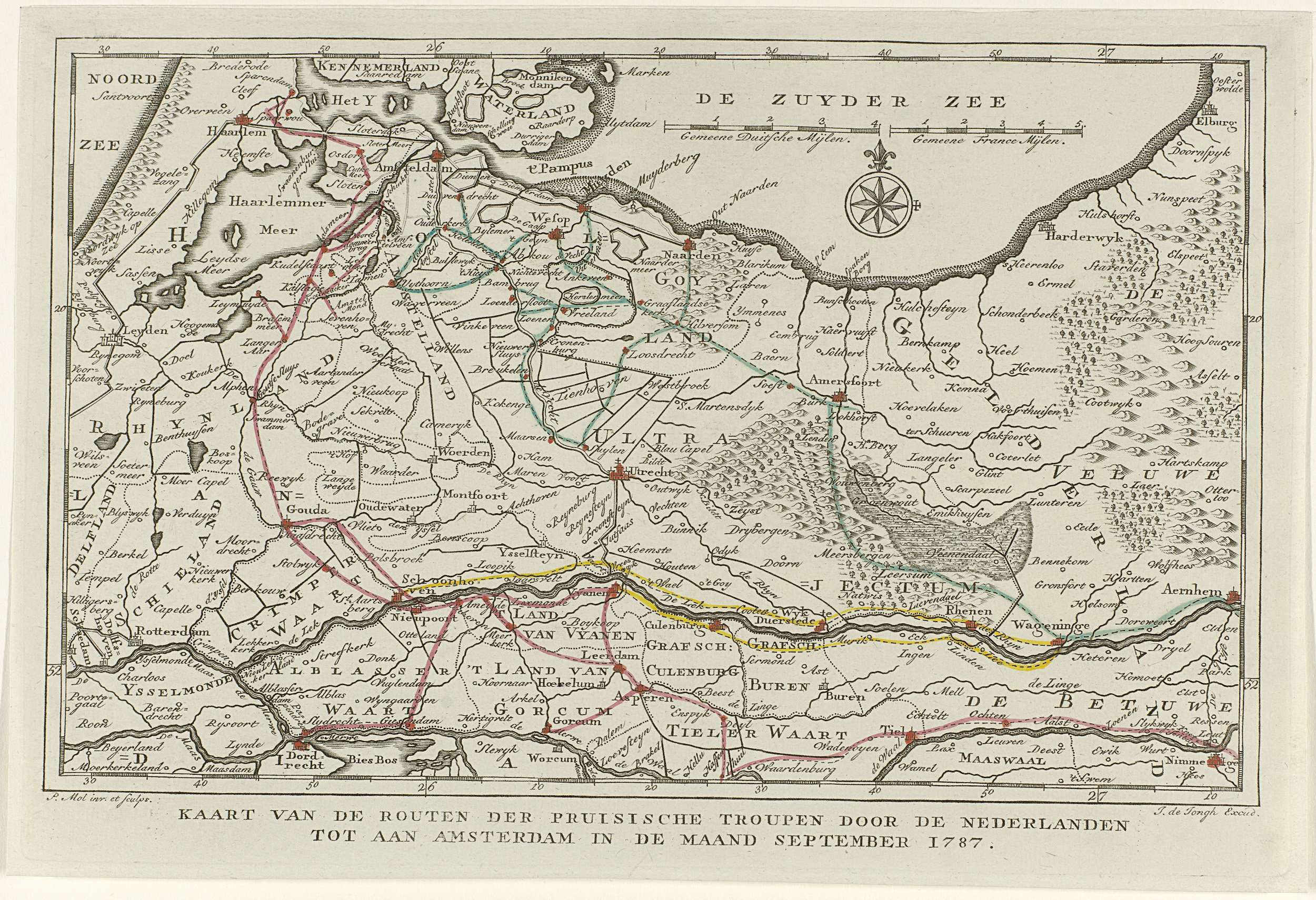 Marskaart waarop de routes zijn aangegeven die de Pruisische troepen gevolgd hebben onderweg naar Amsterdam, tijdens de interventie in de Nederlanden in september 1787.