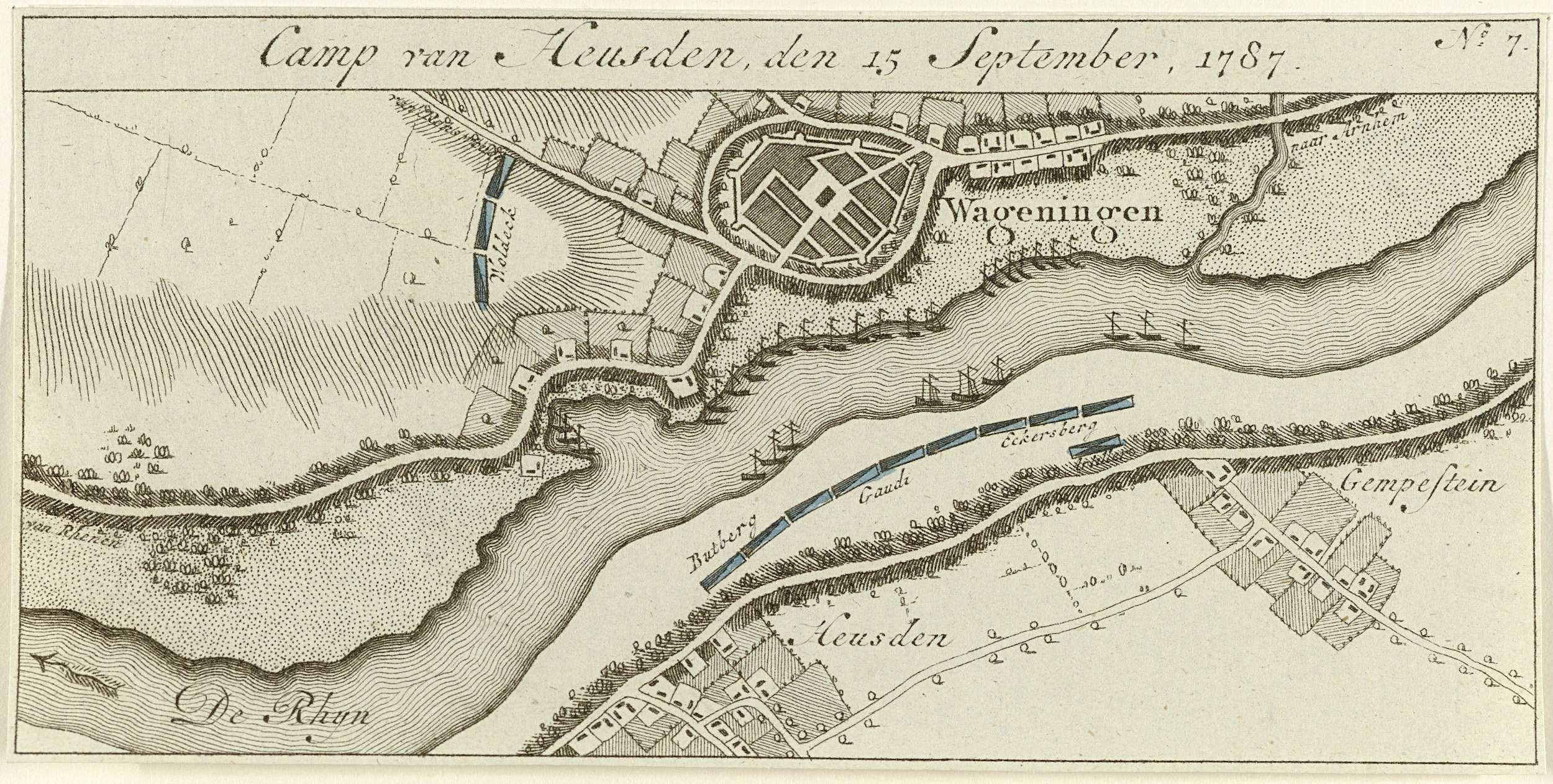 Kaart met de ligging van het kampement van de Pruisische troepen bij Heusden op 15 september 1787. Onderdeel van een groep van veertien genummerde kaartjes van de kampementen van de Pruisische troepen tijdens de interventie in de Nederlanden in september 1787.