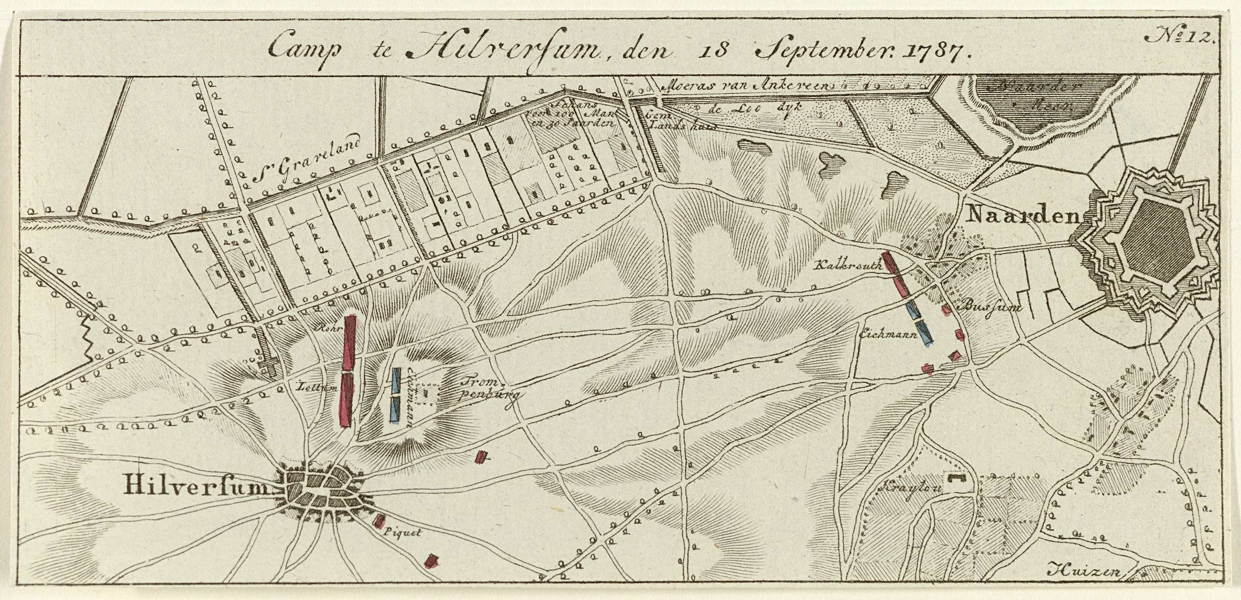 Kaart met de ligging van het kampement van de Pruisische troepen bij Hilversum op 18 september 1787. Onderdeel van een groep van veertien genummerde kaartjes van de kampementen van de Pruisische troepen tijdens de interventie in de Nederlanden in september 1787.