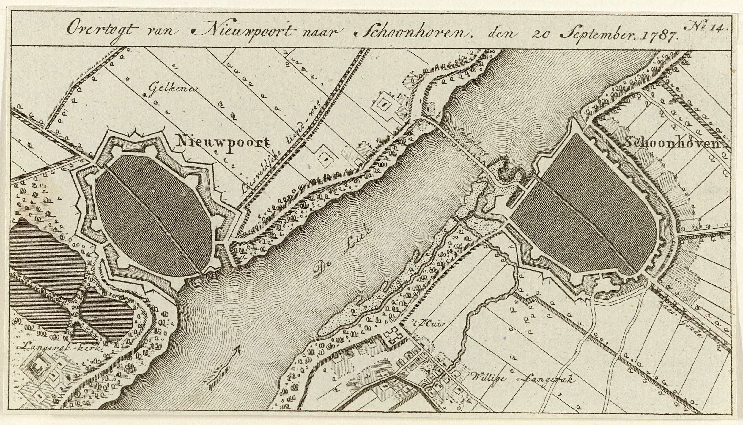 Kaart met de ligging van de schipbrug waarmee de Pruisische troepen bij Schoonhoven en Nieuwpoort de rivier de Lek zijn overgestoken op 20 september 1787. Onderdeel van een groep van veertien genummerde kaartjes van de kampementen van de Pruisische troepen tijdens de interventie in de Nederlanden in september 1787.