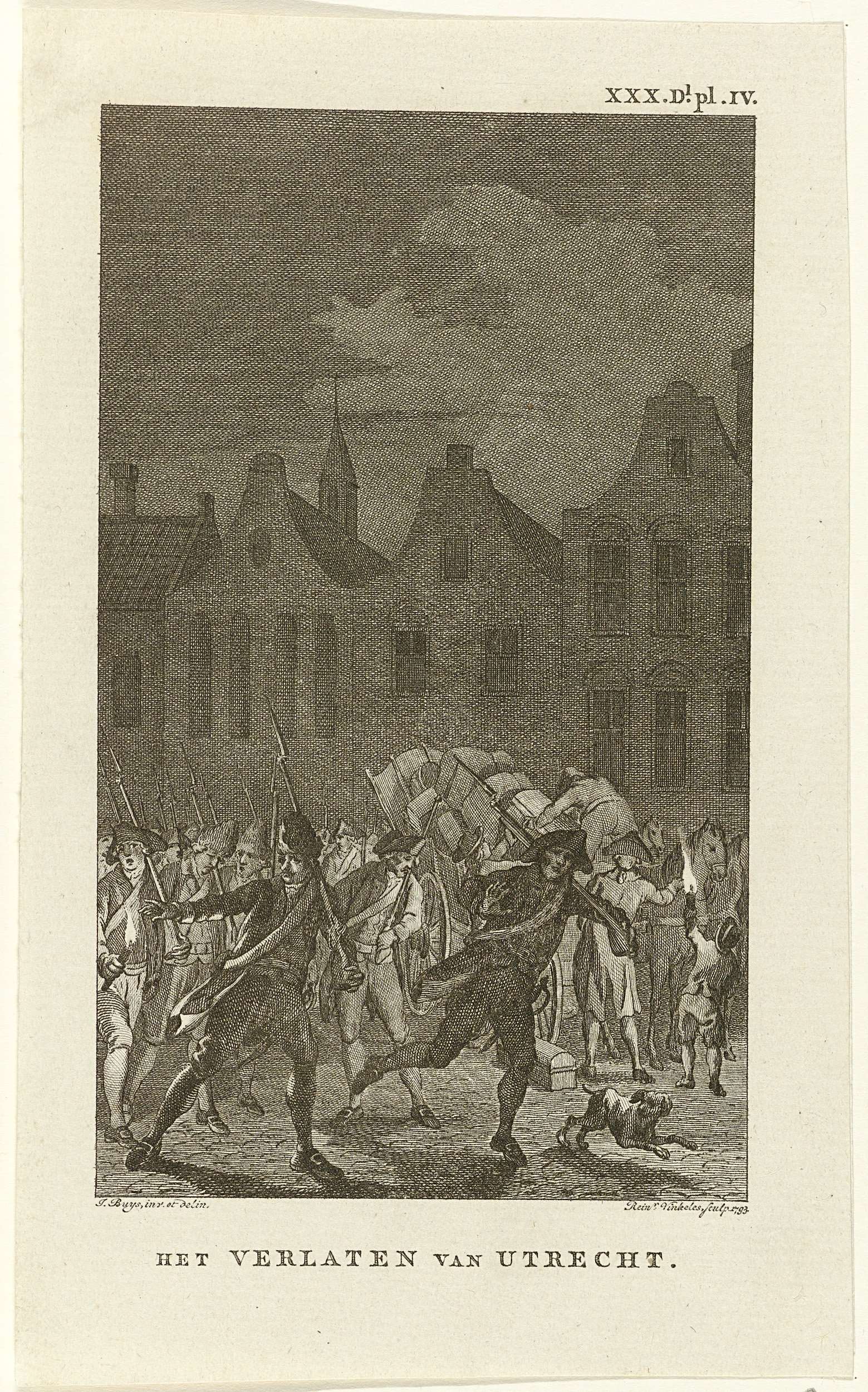 Uittocht van patriotten uit Utrecht, in de nacht van 15 op 16 september 1787, bij het naderen van de Pruisische troepen. Genummerd rechtsboven: XXX.Dl.pl.IV.