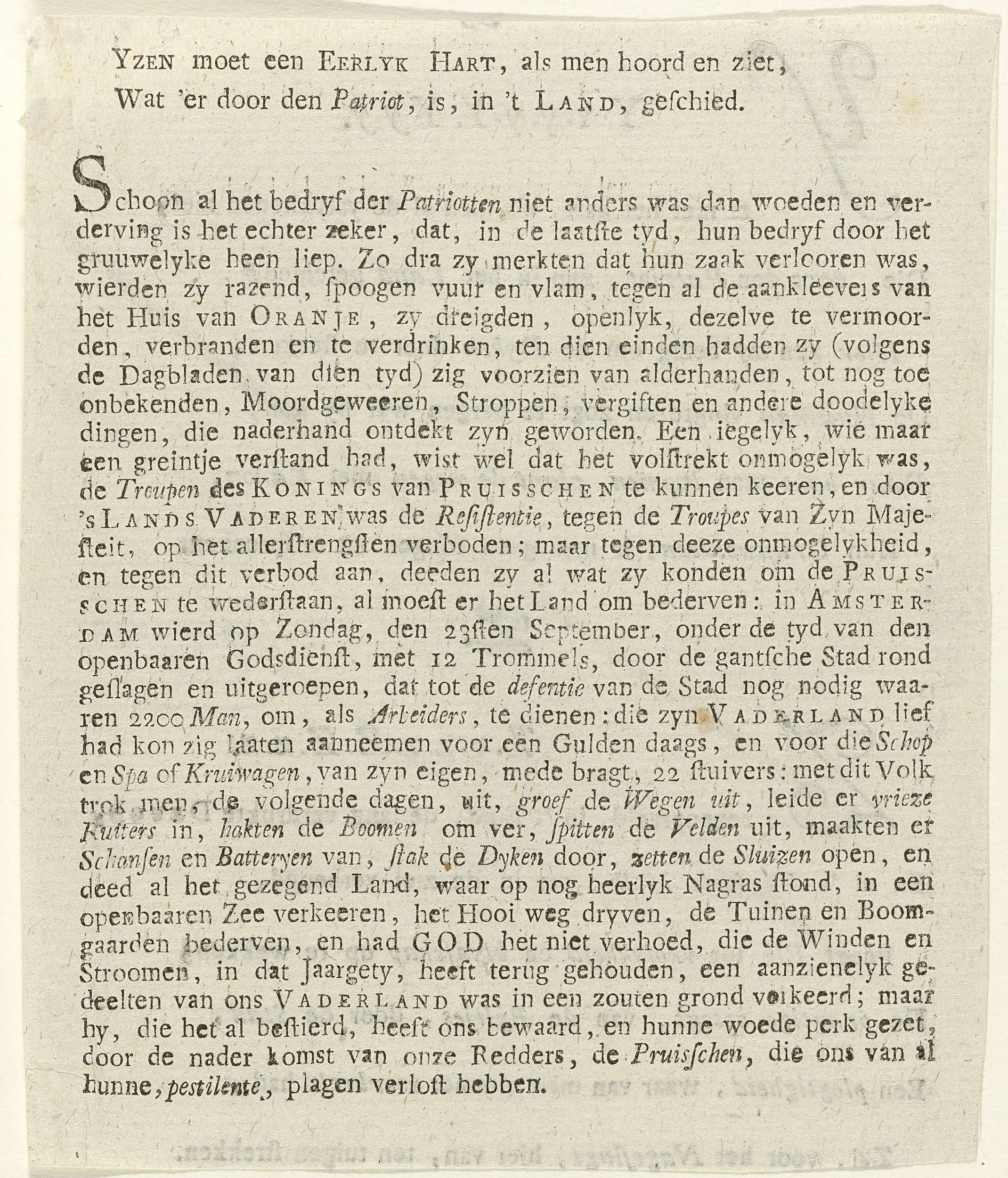 Uitgeknipt tekstblad met het verhaal van de verwoestingen en plunderingen aangericht door de patriotten tijdens de uittocht uit Utrecht en Holland in september 1787, bij het naderen van de Pruisische troepen. Op de achterzijde verzen bij de letters Y en Z. Blaadje bij de prent behorend bij de letter Y uit een ABC boek.