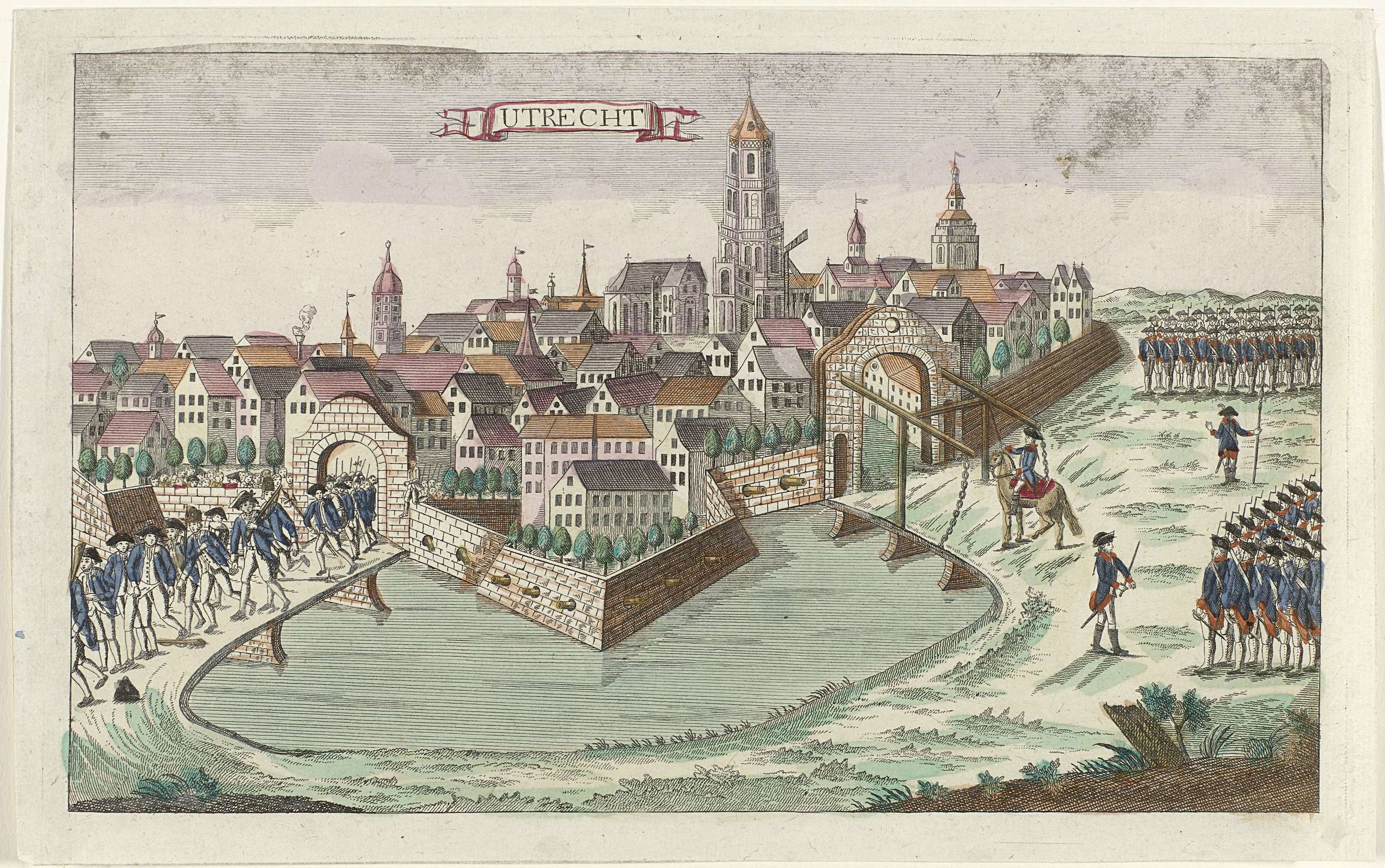 Gezicht op de stad Utrecht, met links de uittocht van patriotten uit Utrecht op 16 september 1787 en rechts de aankomst van de Pruisische troepen.