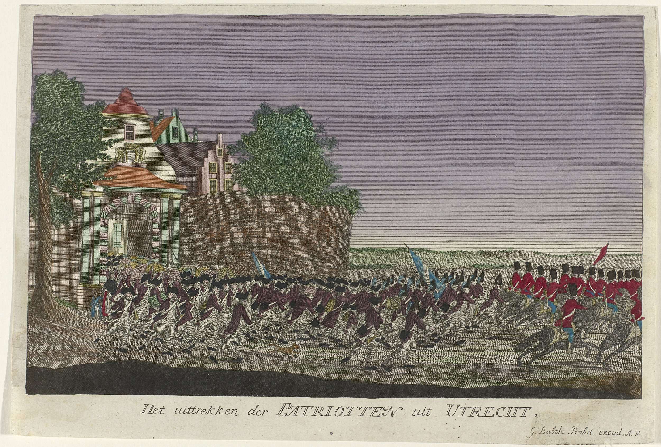 De legers van de patriotten verlaten in paniek door een stadspoort de stad Utrecht in de nacht van 15 op 16 september 1787 bij het naderen van de Pruisische troepen.