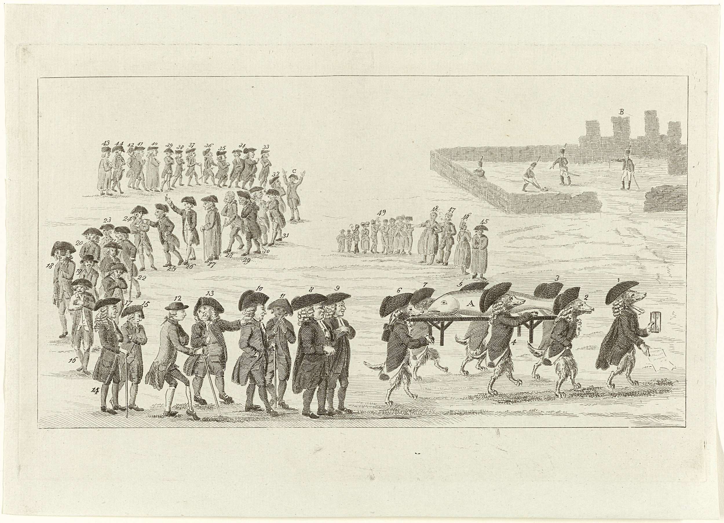 Spotprent op de Rijngraaf van Salm. Een begrafenisstoet waarin keeshonden een baar dragen waarop een overleden zalm ligt. Achter de baar loopt een stoet van patriotten aangeduid met nummers. Op de achtergrond rechts een kerkhof waar Pruisische soldaten een graf graven voor de vis. Naar aanleiding van het verlaten van Utrecht door de Rijngraaf en ...