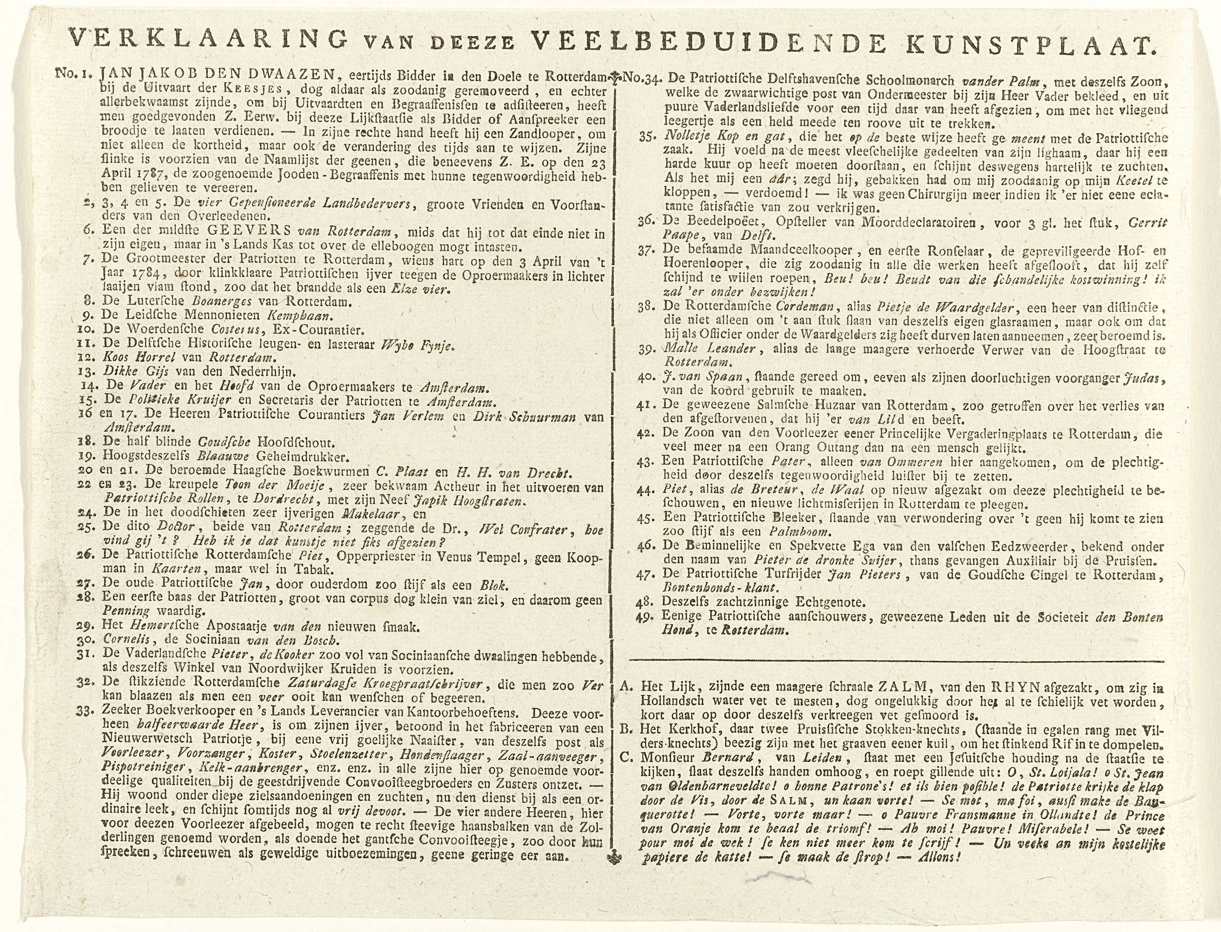 Tekstblad met een verklaring van de voorstelling van de spotprent op de Rijngraaf van Salm. Met legenda 1-49 en A-C.