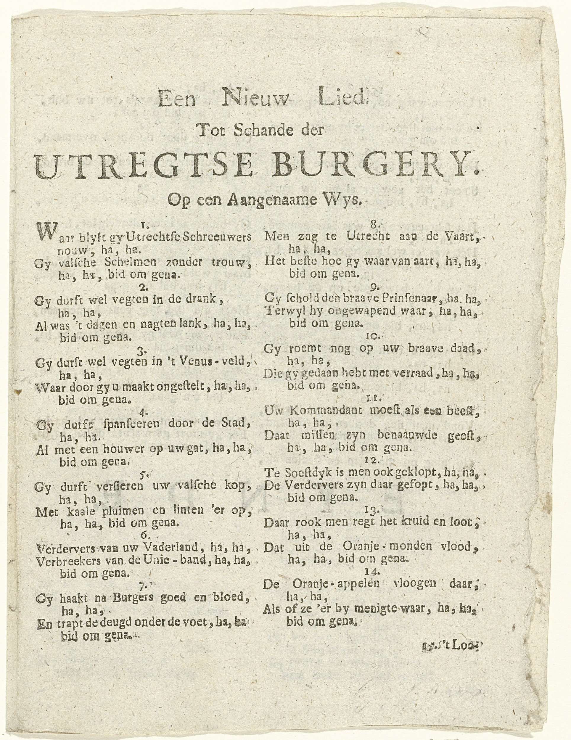 Dubbelgevouwen blad met twee liederen op vier bladzijden. Lied op de vlucht van de patriotten uit Utrecht in september 1787 en een lied ter ere van prins Willem V. Boven het tweede lied een houtsnede met het wapen van Holland in de Hollandse Tuin.