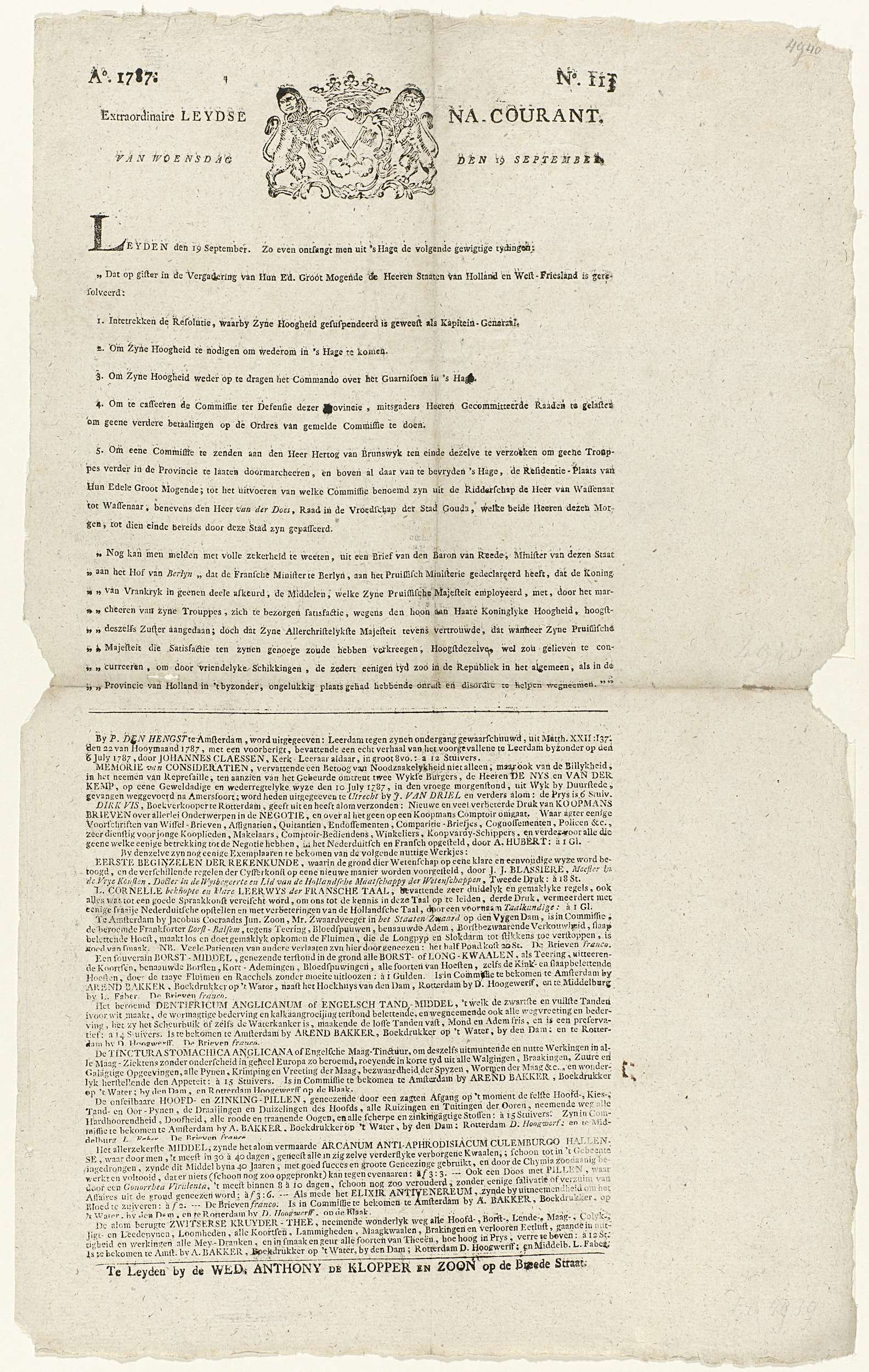 Aflevering van de krant de Extraordinaire Leydse Na-Courant, van 19 september 1787, nr. 113. Bovenaan het stadswapen van Leiden, daaronder het nieuws over het herstel van de stadhouder Willem V in Den Haag.