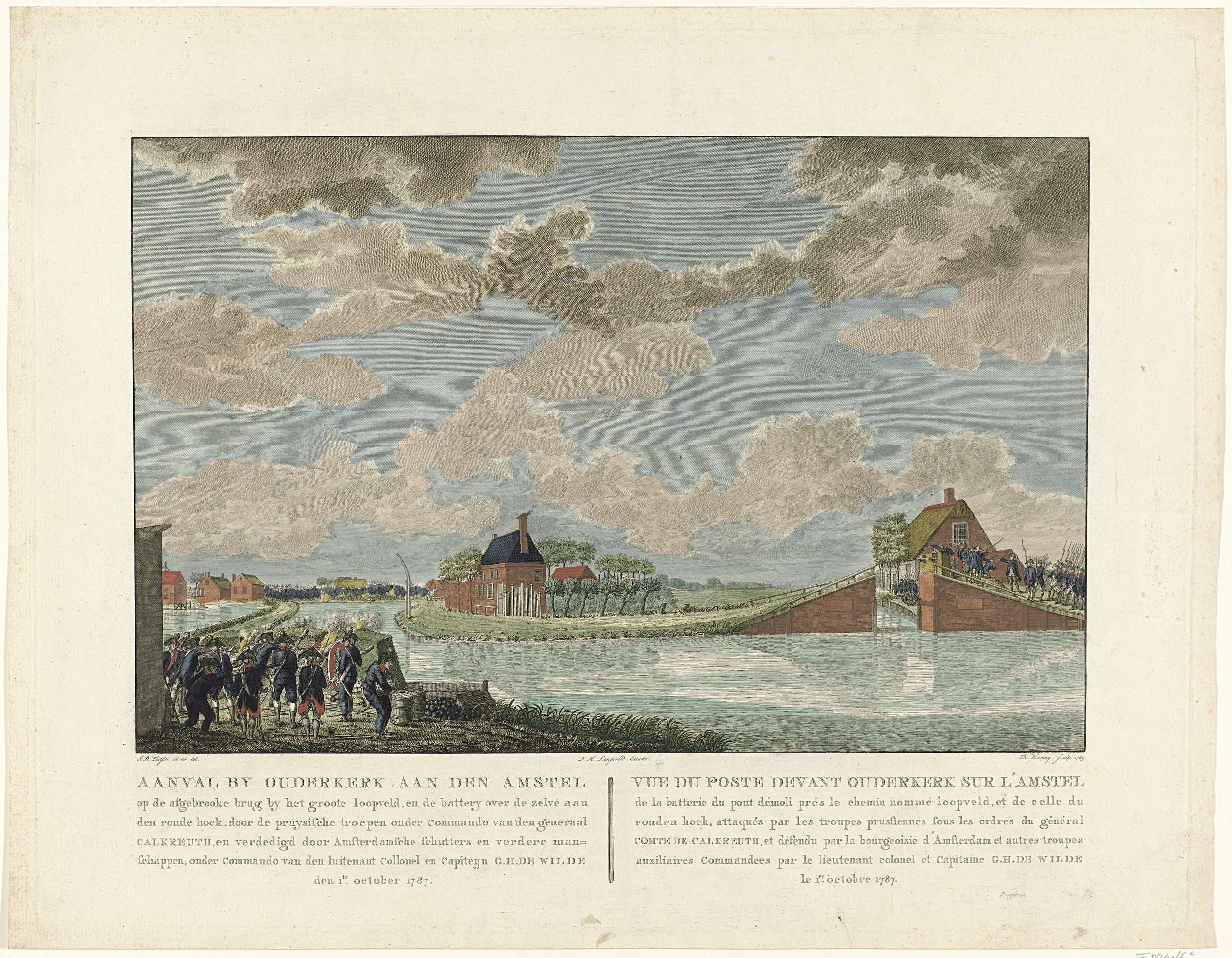 Aanval bij de afgebroken brug bij het grote loopveld in Ouderkerk aan de Amstel door de Pruisische troepen onder commando van generaal Friedrich Adolf von Kalckreuth, verdedigd door Amsterdamse schutters onder commando van kolonel George Hendrik de Wilde, 1 oktober 1787. Onderdeel van een groep van zeven prenten van de gevechten met de Pruissische troepen ...
