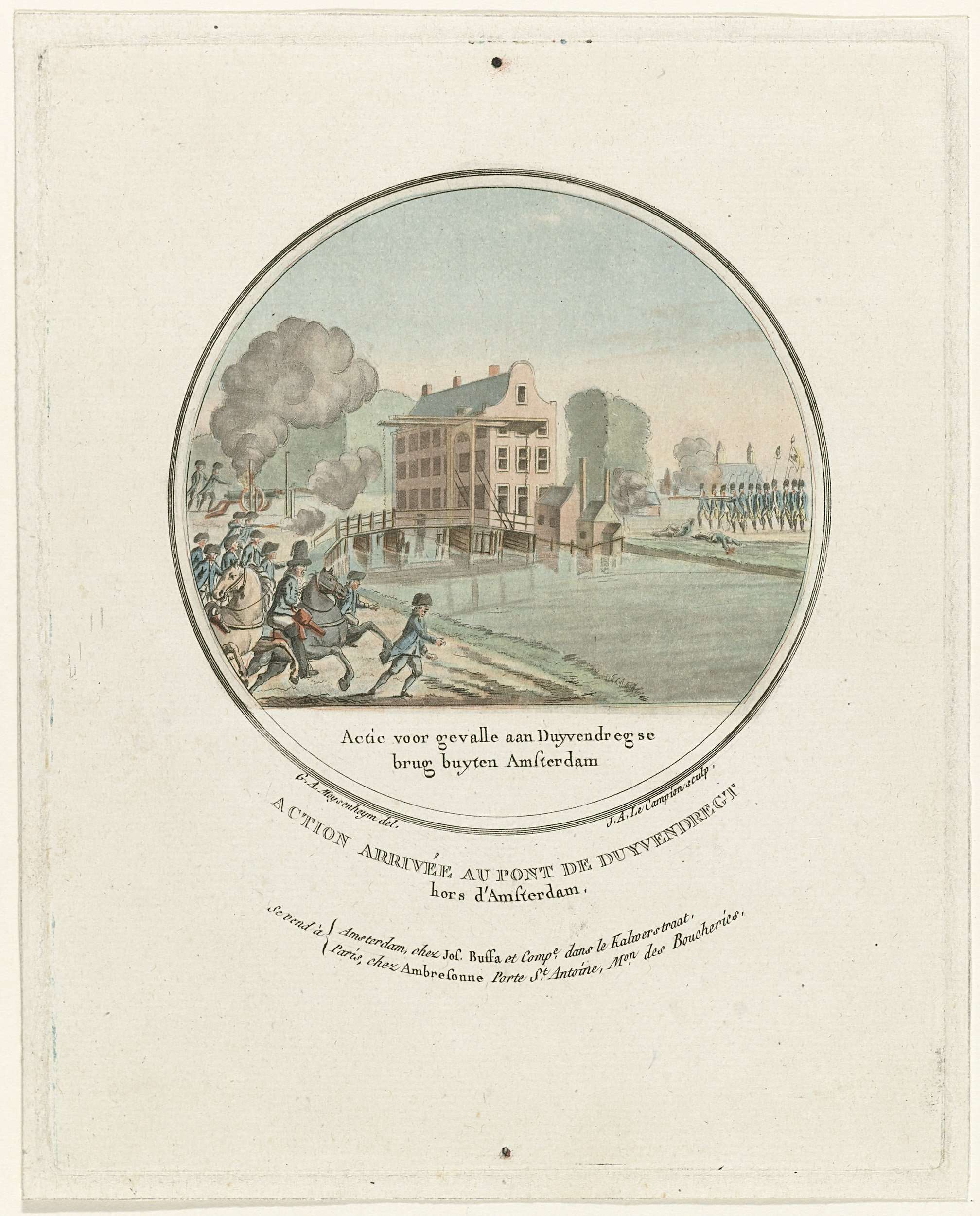 Aanval bij de Duivendrechtse brug door de Pruisische troepen, 1 oktober 1787. Onderdeel van een reeks van vier Franse voorstellingen van de Pruisische aanvallen om en bij Amsterdam, in ronde medaillons.