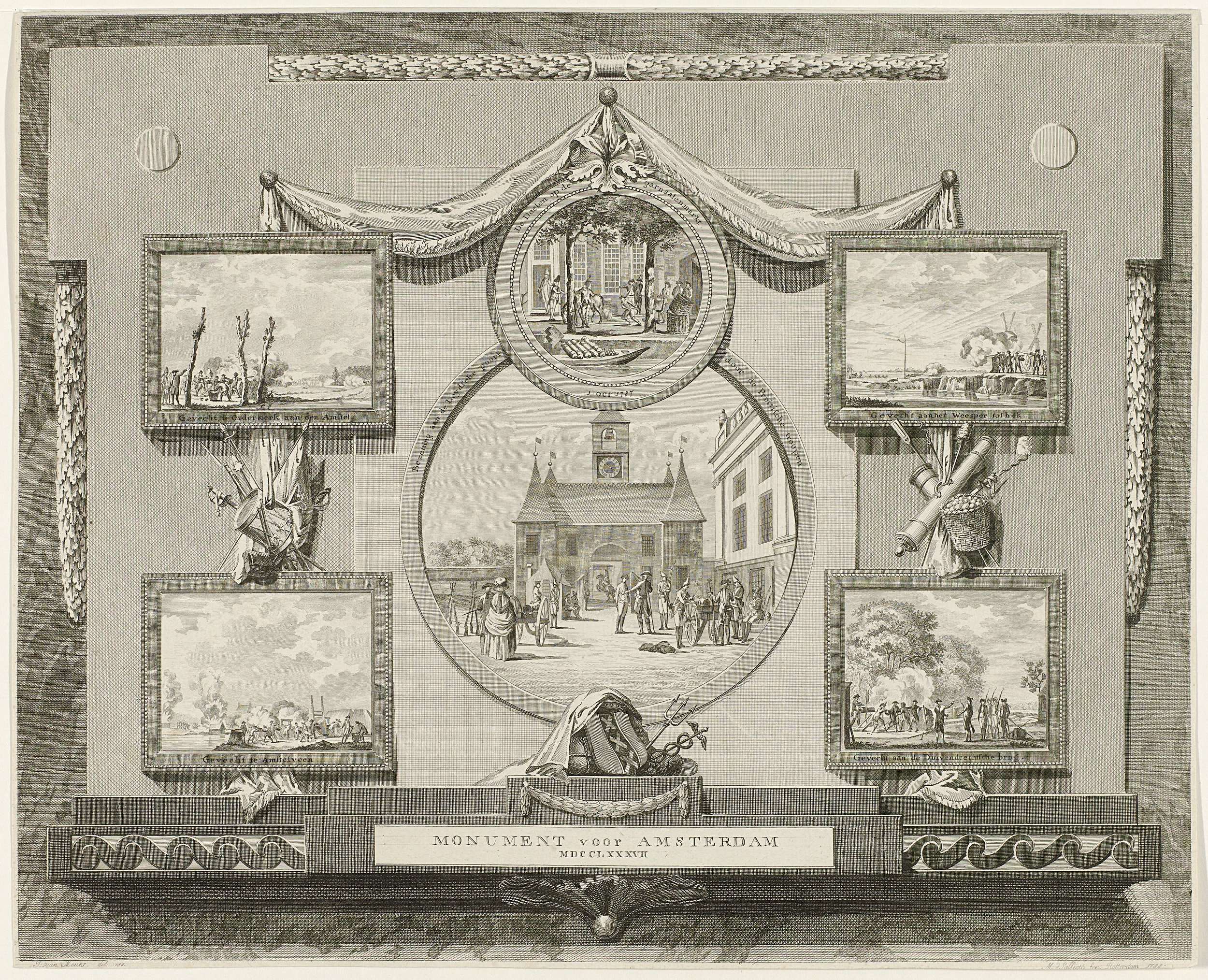 Blad met zes voorstellingen van de gebeurtenissen in en rond Amsterdam met de komst van de Pruisische troepen in oktober 1787. Vier vierkante scènes van de gevechten in de omgeving van Amsterdam. Centraal twee medaillons met de Garnalendoelen en de bezetting van de Leidsepoort door de Pruisen op 10 oktober 1787. Bij de prent hoort ...