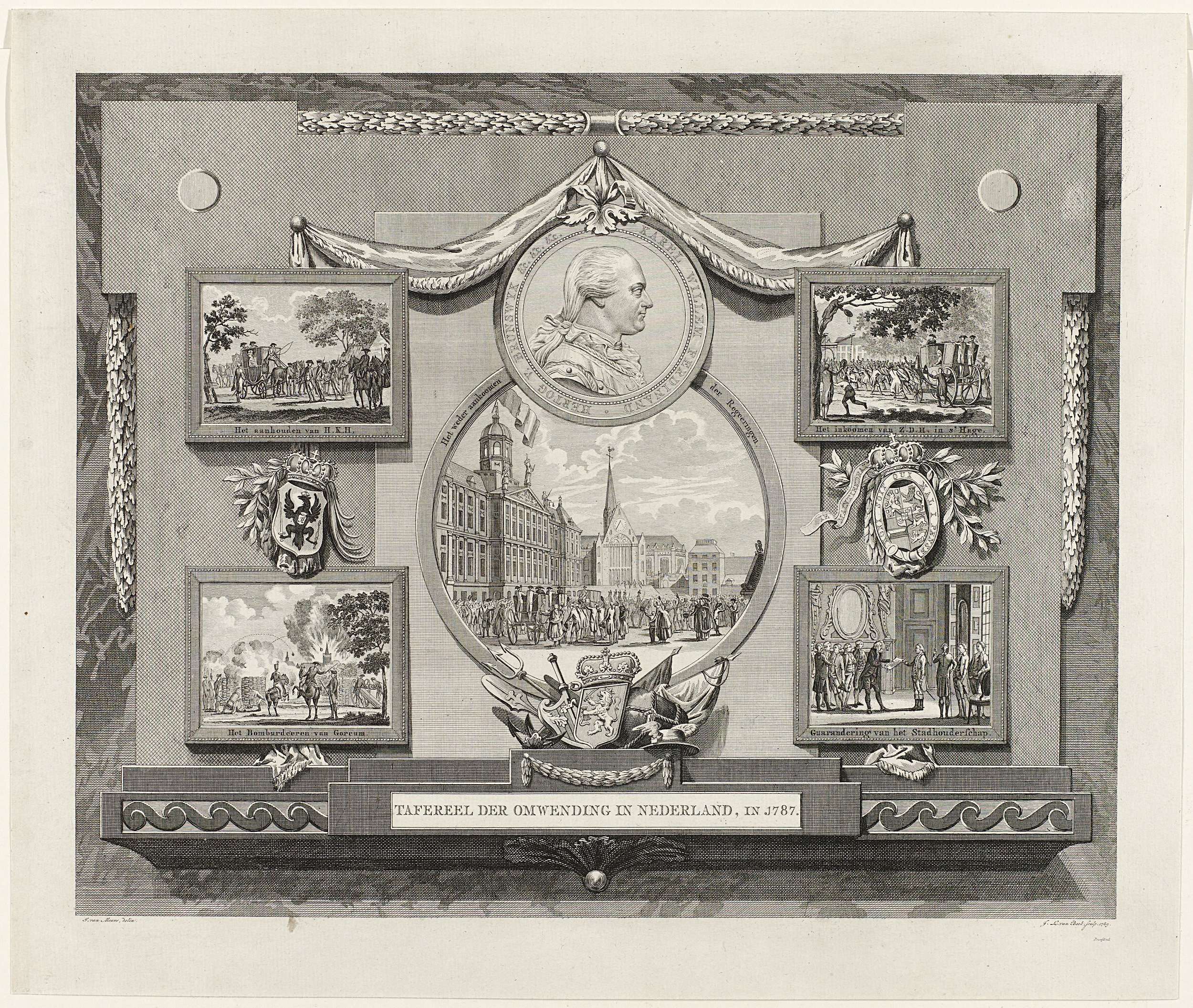 Blad met zes voorstellingen van de opvallendste gebeurtenissen in Nederland in het jaar 1787. Vier vierkante voorstellingen van de aanhouding bij Goejanverwellesluis, de inhaling van de prins in Den Haag, het herstel van de erfstadhouderschap en het bombardement van Gorcum. Centraal twee medaillons met een portret van de hertog van Brunswijk en het herstel van ...