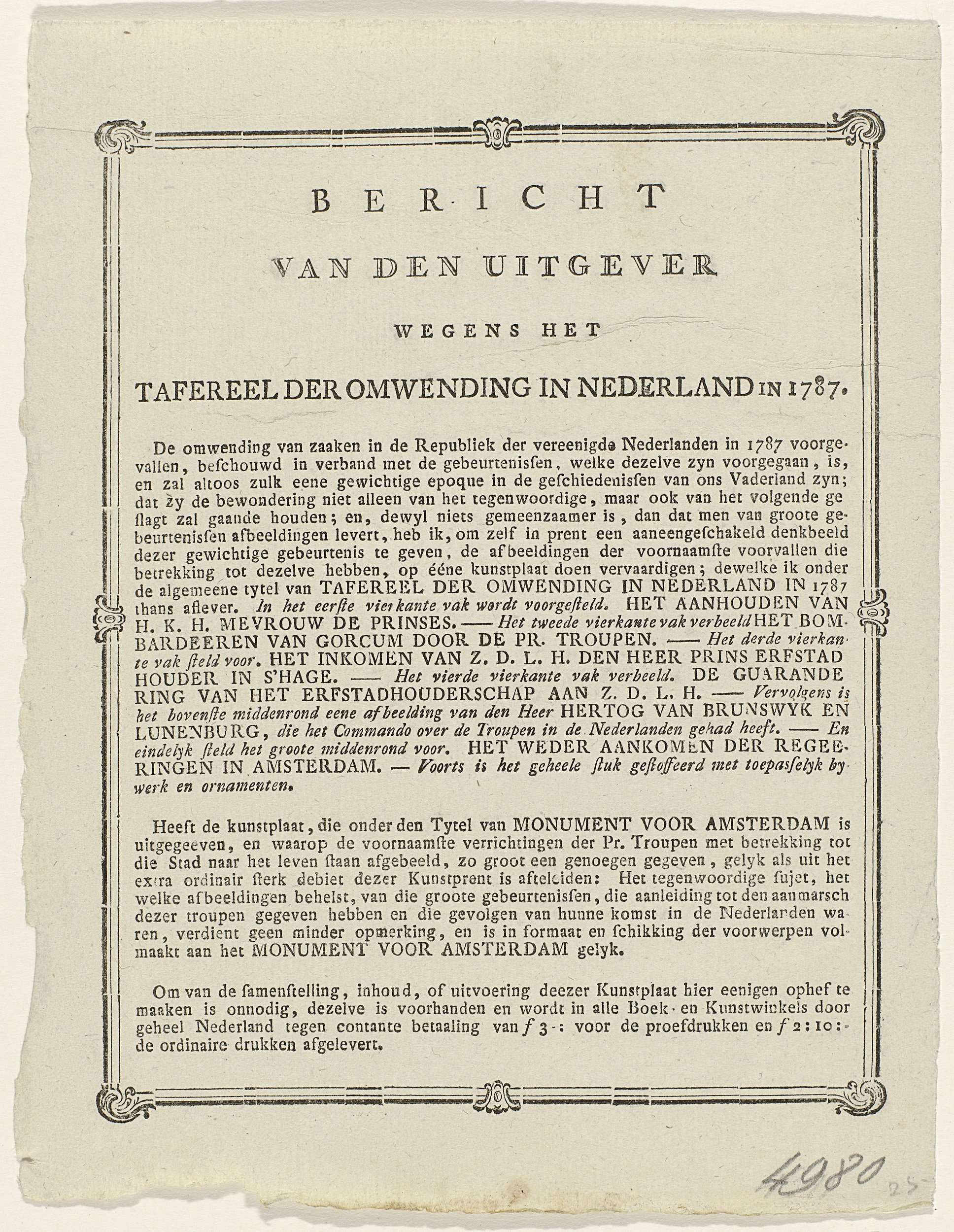 Bericht van de uitgever behorend bij de prent Omwentelingen in 1787. Over het belang van de prent, uitleg van de voorstellingen en opgave van de prijzen van de uitgave.