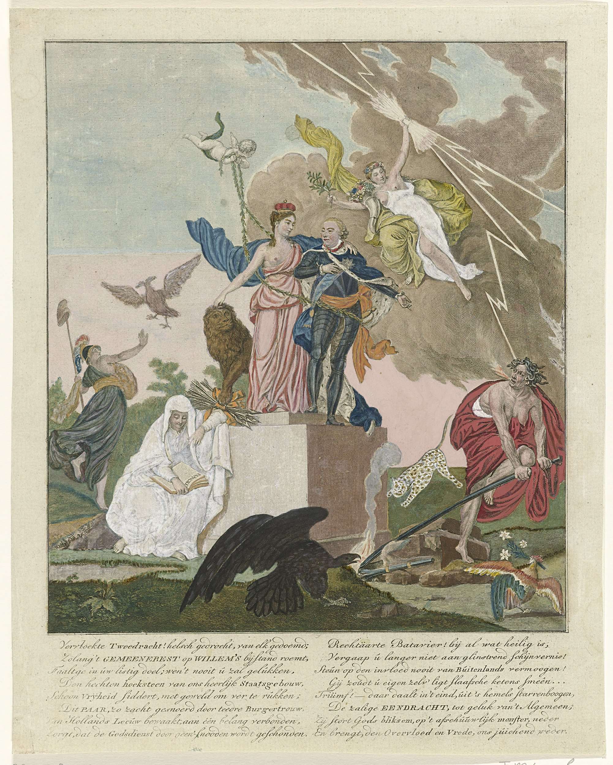 Orangistische allegorie op het herstel van stadhouder Willem V in 1787. De stadhouder staande op een hoeksteen met de Nederlandse Maagd en Leeuw. Tweedracht probeert tevergeefs de hoeksteen van het Staatsgebouw omver te werpen. Een Pruisische adelaar verjaaagt de Franse haan en de Engelse panter. De Eendracht laat vanuit de hemel bliksemschichten neerdalen op de ...