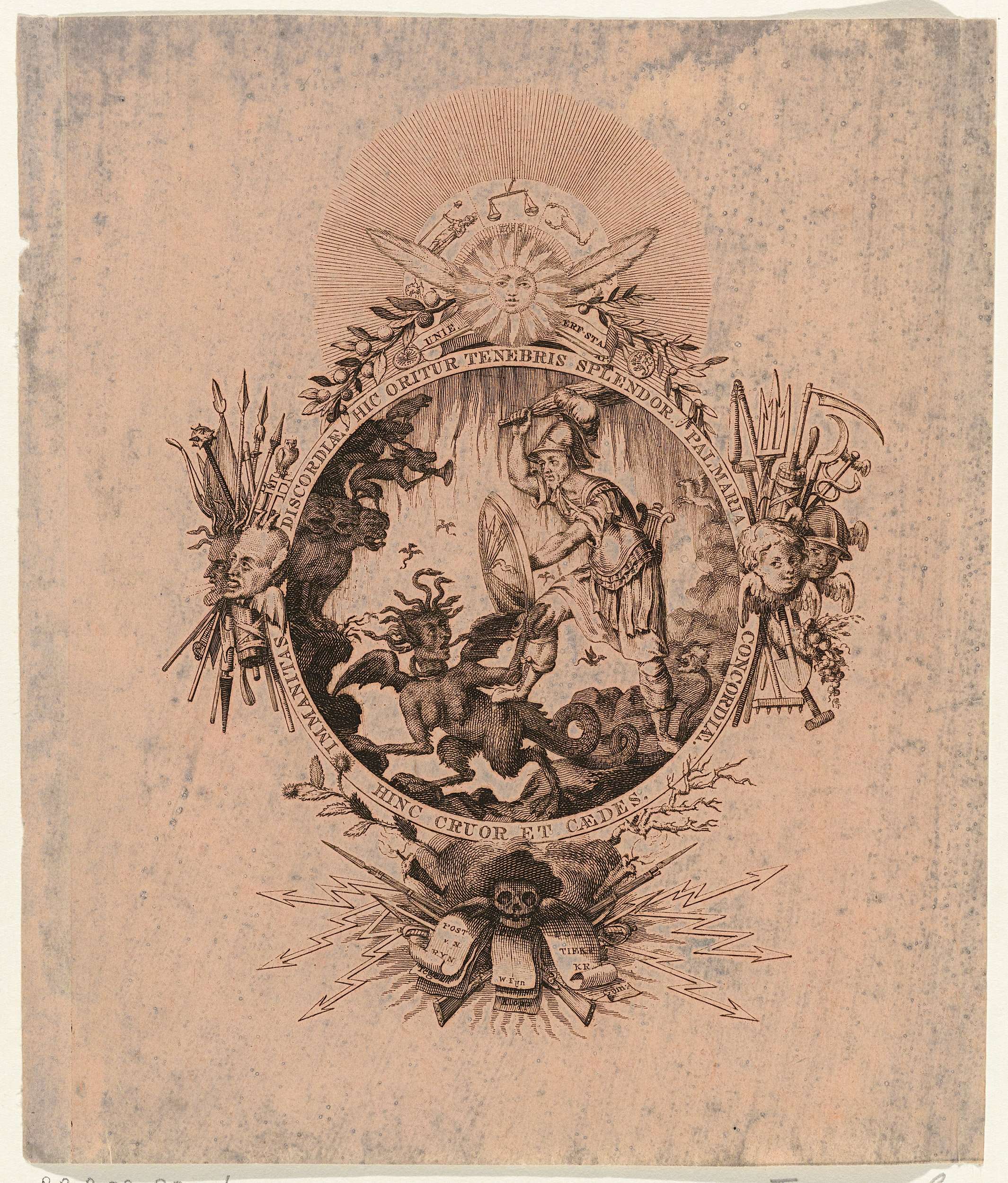 Orangistische allegorische voorstelling waarin een Batavier als Hercules het monster van de Tweedracht naar de hel verjaagt. Aan de linkerzijde van het medaillon een trofee met de wapens van de Tweedracht, aan de rechterzijde een trofee met de wapens van de Eendracht. Bovenaan schijnt de zon met Oranjetak en olijftak, onderaan heerst duisternis met een ...