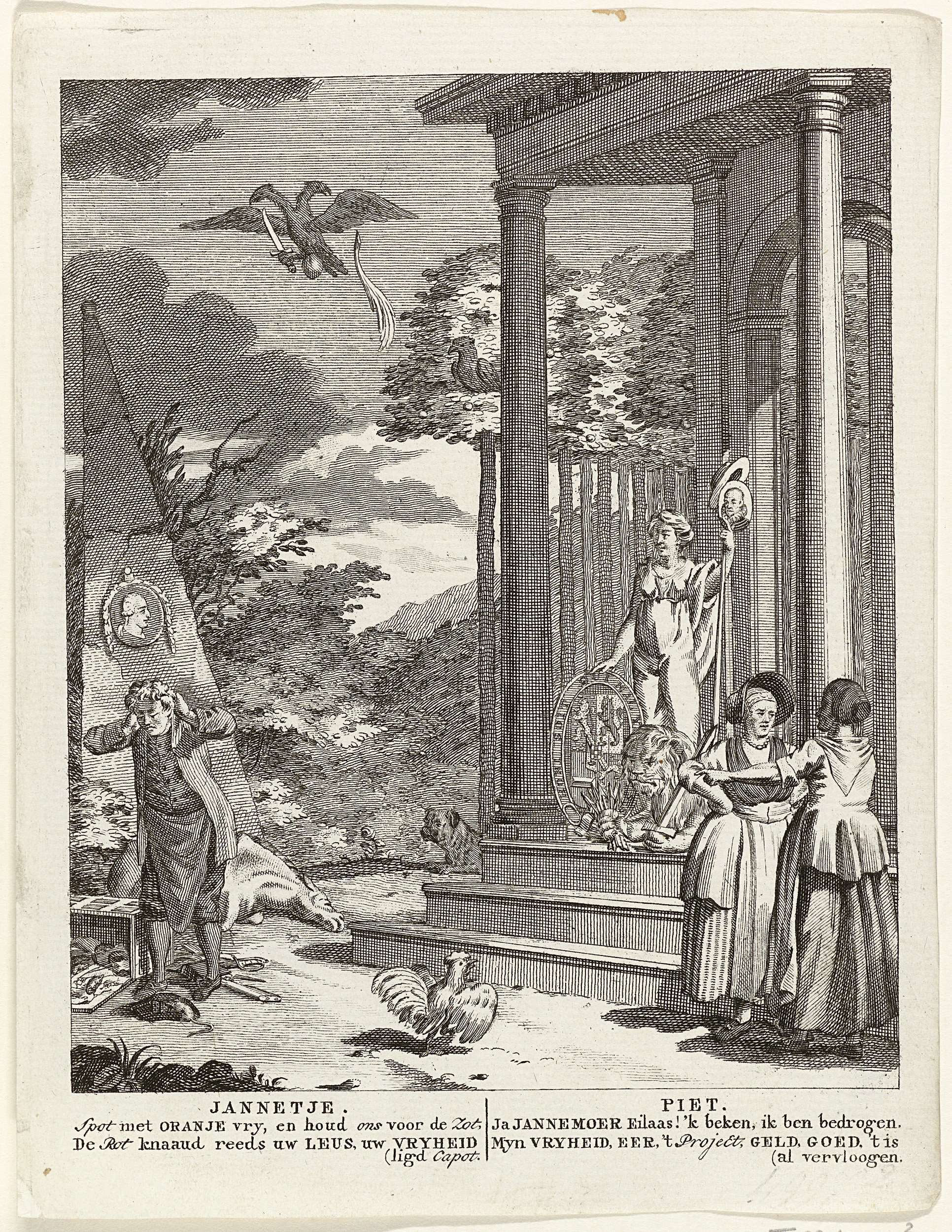 Allegorische voorstelling op het herstel van stadhouder Willem V in 1787. De Nederlandse Maagd en Leeuw bewaken de ingang van een tempel. Links wanhoopt een patriot, op de grond liggen uniform en wapens van de vrijkorpist. Rechts praten twee vrouwen, Jannetje en Piet, met elkaar; hun gesprek staat in de vier regels van het onderschrift.