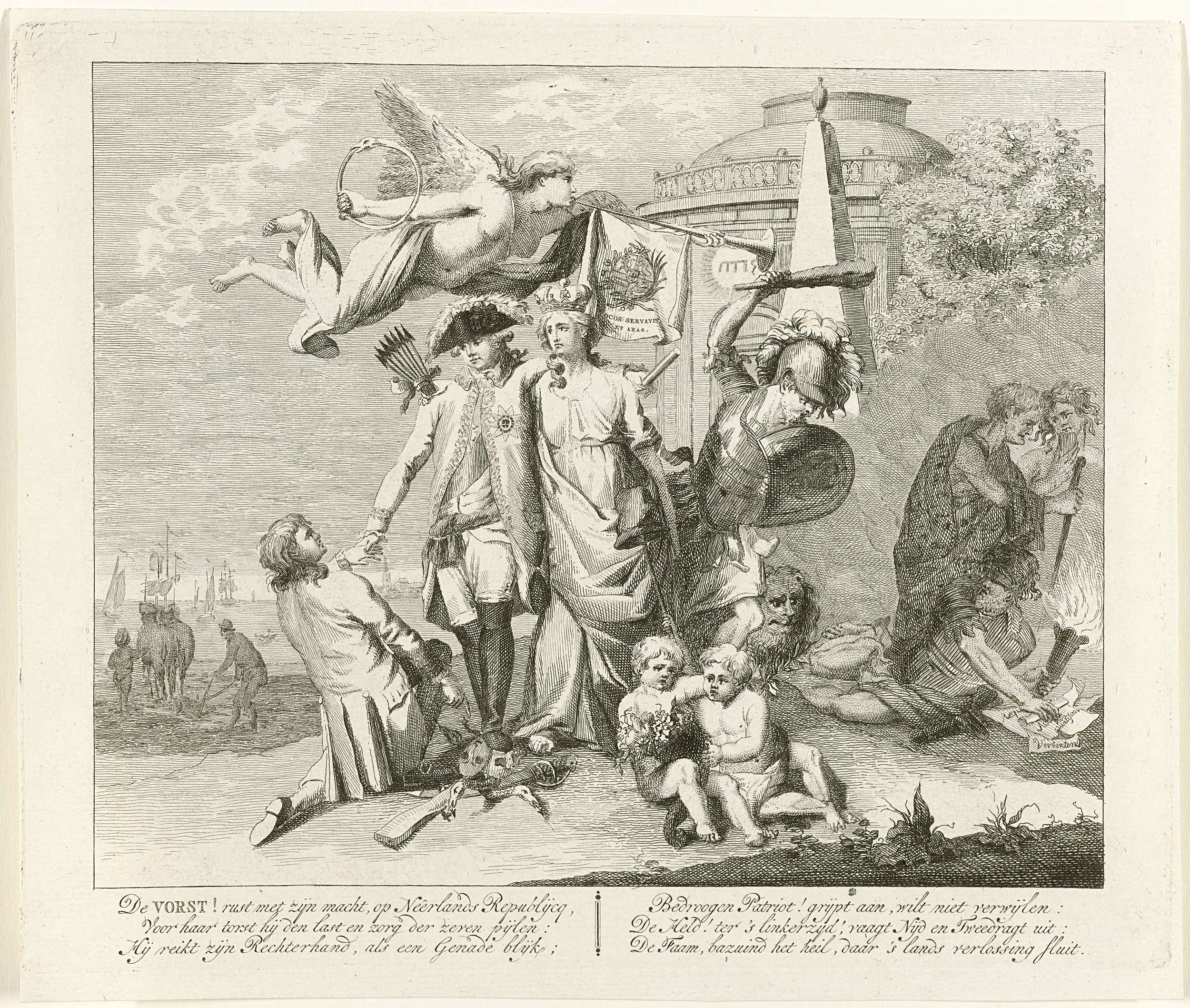 Allegorische voorstelling op het herstel van stadhouder Willem V in 1787. De prins, steunend op de Nederlandse Maagd, reikt de hand aan een voor hem knielende vrijkorpist. Een krijger (Pruisen) verjaagt Nijd en Tweedracht. Op de achtergrond een tempel met het tetragram, in de lucht de Faam. Met achtregelig onderschrift.