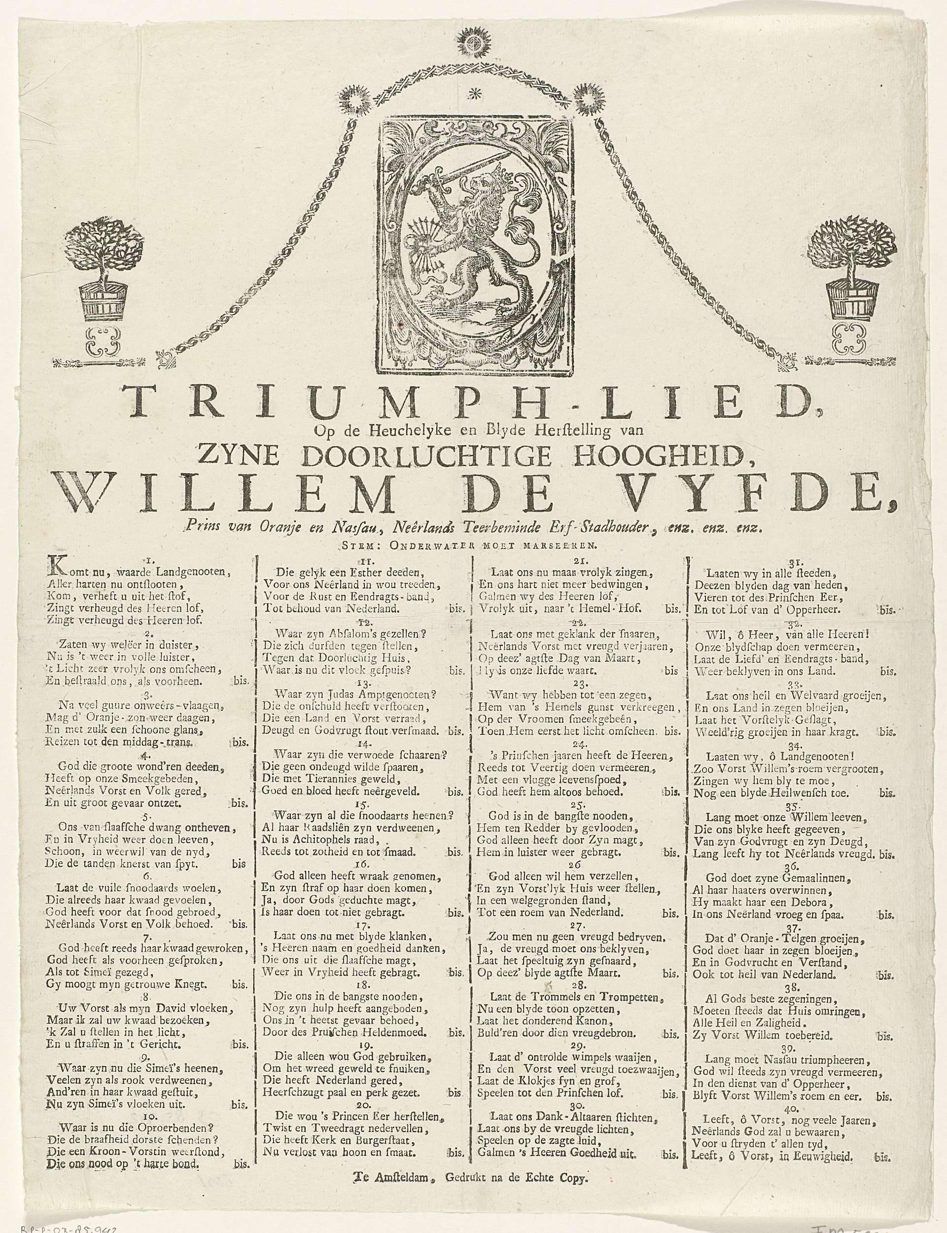 Blad met de tekst van een lied van 40 coupletten op het herstel van stadhouder Willem V in 1787. Bovenaan een vignet met de Nederlandse Leeuw en twee Oranjebomen.