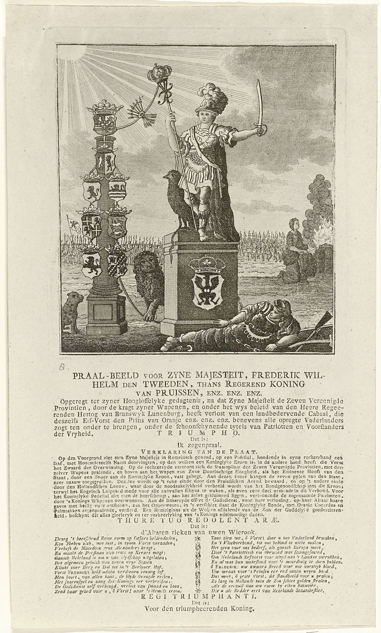 Allegorische voorstelling met een standbeeld opgericht ter ere van de Pruisische koning Frederik II als dank voor zijn ingrijpen in Nederland en het verjagen van de patriotten in 1787. Beeld van de koning verbonden met erezuil met de zeven provinciewapens van Nederland. Op de grond ligt geketend de heerszucht (van de patriotten). Op het blad ...