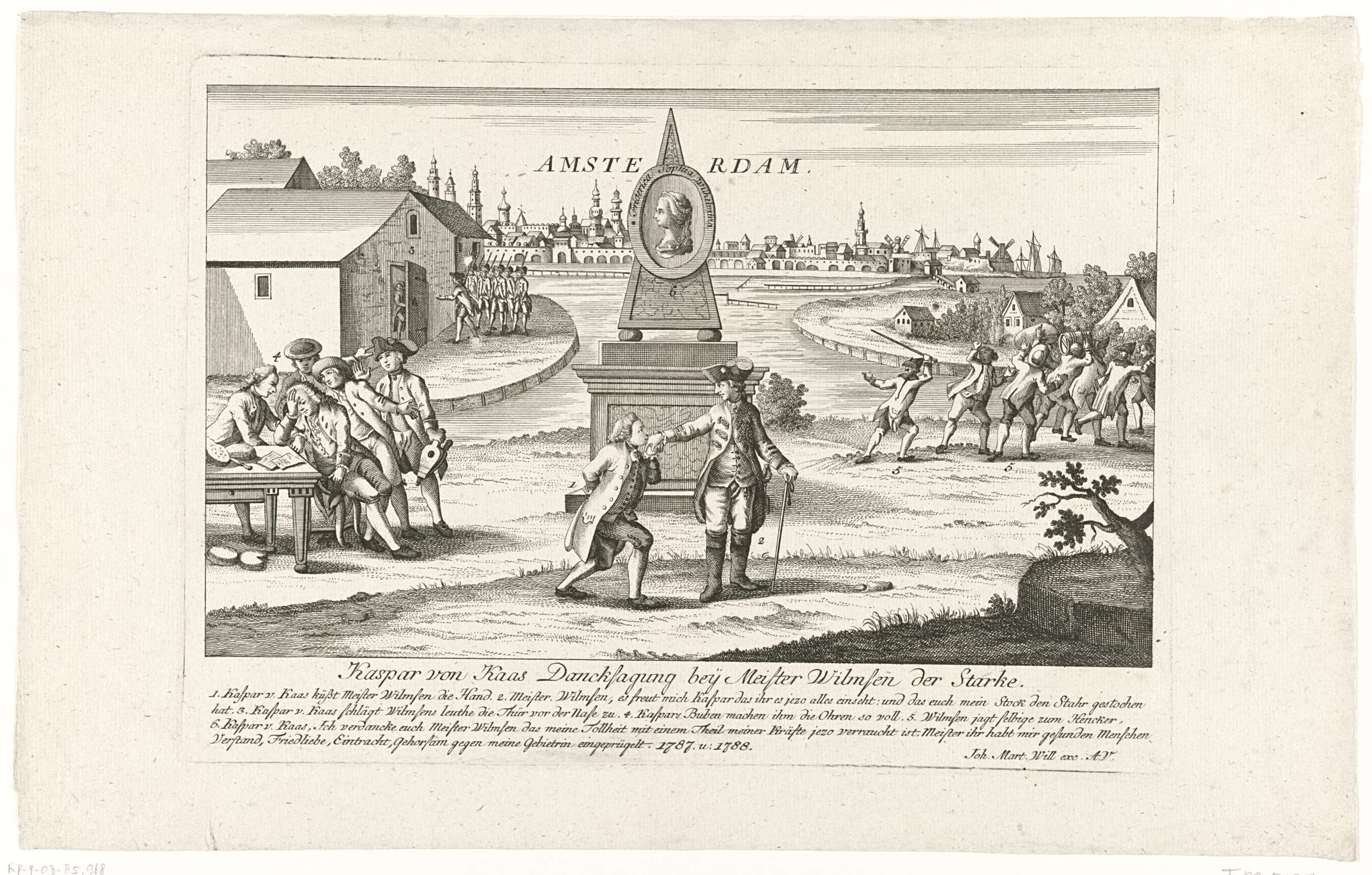 Spotprent op burgemeester Hendrik Danielsz. Hooft die knielend de hand van prins Willem V kust. Centraal een erezuil met medaillon van Wilhelmina van Pruisen. Op de achtergrond de stad Amsterdam. Naar aanleiding van het ontslag van Hooft als burgemeester van Amsterdam op 27 november 1787.