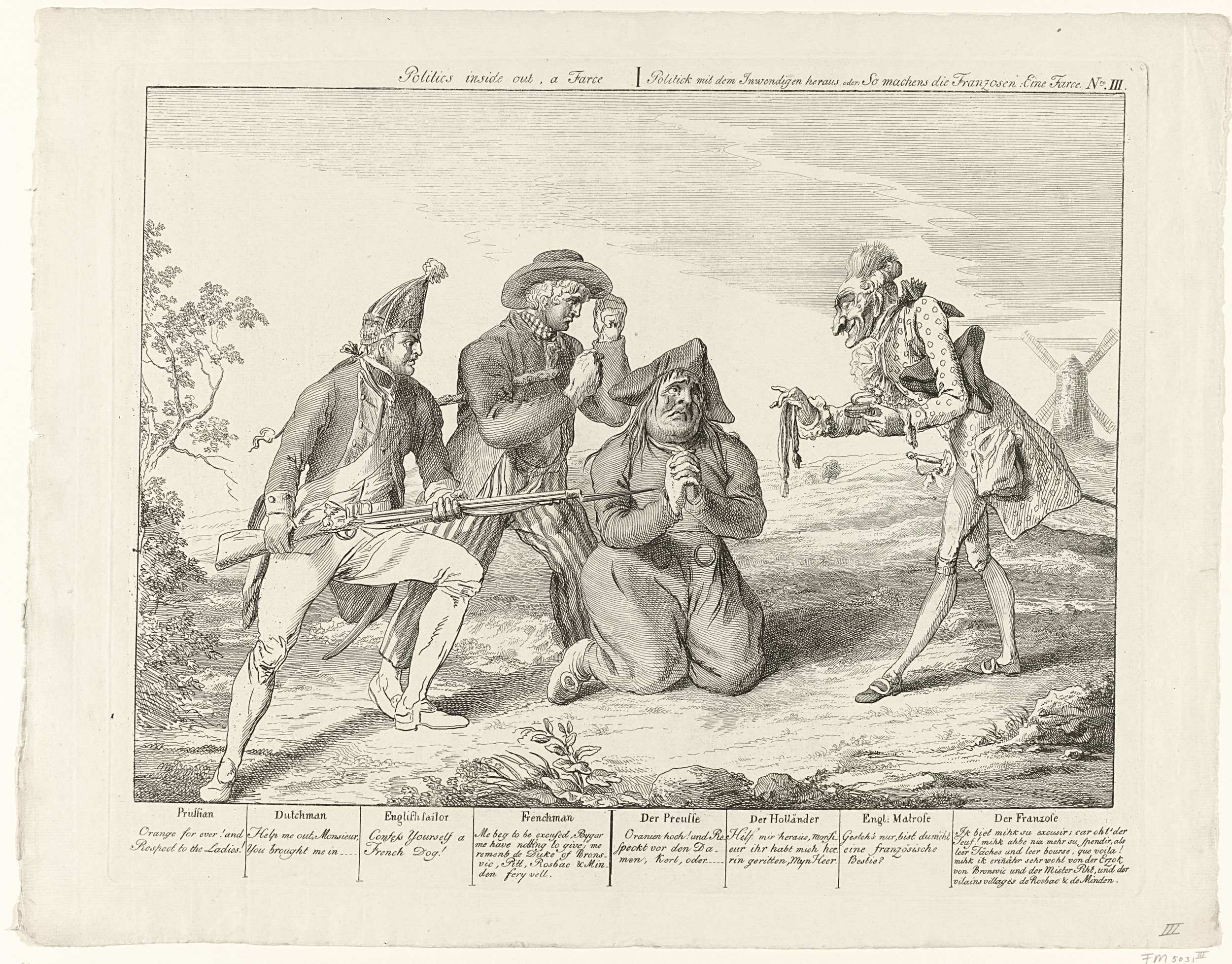 Een Hollandse patriot knielt op de grond en smeekt een Fransman om hulp. De Fransman toont hem echter smalend zijn lege beurs. Links een Pruisische soldaat en een Engelse matroos. In het onderschrift de teksten van de vier hoofdpersonen. Onderdeel van een groep van vier spotprenten op de patriotten ten tijde van de Pruisische inval ...